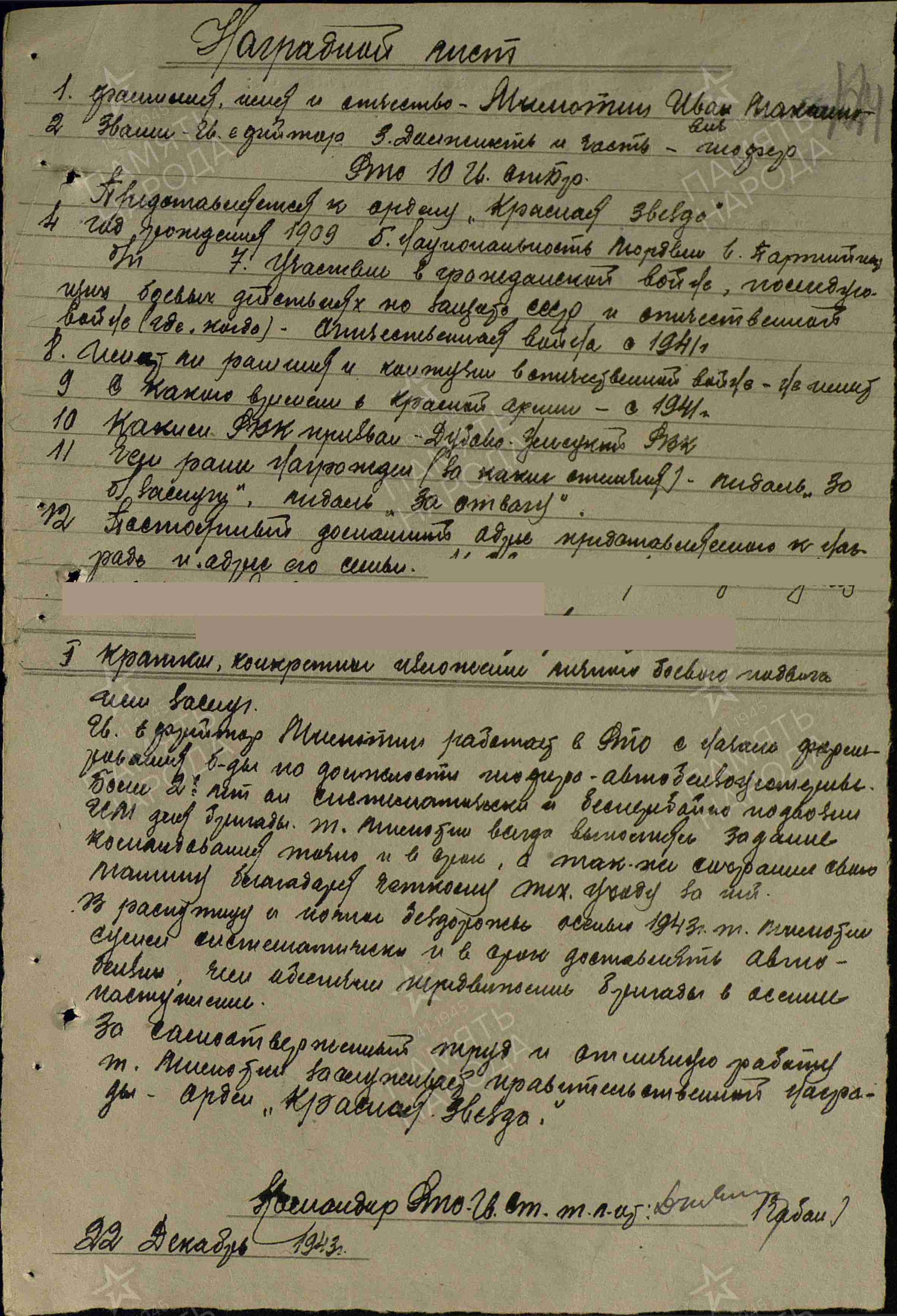 Информация из Наградного листа к медали «За отвагу» (1943 г.): «Тов. Милютин, работая шофером на автобензоцистерне ЗИС-5 в 10 гв. отбр с первых дней ее формирования (ноябрь м-ц 1941 г.) по настоящее время, показал себя в работе по обеспечению бригады горючим опытным, дисциплинированным, смелым и находчивым шофером. За два года боевых действий бригады тов. Милютин не считался со сном, отдыхом, временем, с трудными метеорологическими условиями всегда вовремя, самоотверженно доставлял горючее для танков и автомашин бригады. Во время боевых действий бригады под г. Белым (в июле м-це 1942 г.), под г. Ржевом (в июле-августе м-це 42 г.) тов. Милютину не раз приходилось доставлять горючее к танкам под обстрелом пр-ка. В районах Знаменка, Всходы в марте 1943 г. тов. Милютин сопровождал танки до исходных позиций, где перед боем дозаправлял их. Во время наступательных боев бригады летом в 1943 г. за Дудоровский, ст. Хотынец, г. Карачев и г. Навля тов. Милютин самоотверженно доставлял горючее. Проявив смелость и отвагу 18.7.43 г. под Дудоровским под минометным и арт обстрелом и бомбежки дороги противником, тов. Милютин сумел доставить горючее на исходные позиции во время и под арт обстрелом пр-ка заправил танки. Тов. Милютин принадлежит к наилучшим опытным шоферам бригады, его машина всегда исправна и содержится в порядке. Тов. Милютин достоин правительственной награды медали «За отвагу».