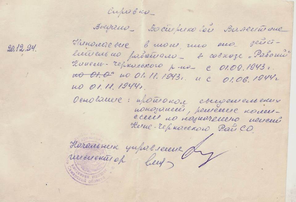 Его жена, Валентина Николаевна Вострикова (в девичьи Болдарева) родилась 23 сентября 1931 года. В военный период, несмотря на свой юный возраст, работала в совхозе «Рабочий» Кинель-Черкасского района, на полевых работах.