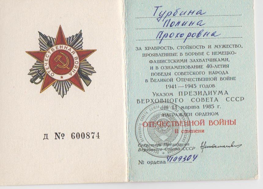 Участник Великой Отечественной войны. Сержант Полина Турбина служила поваром походной кухни. Прошла всю войну до Берлина. Имеет многочисленные награды.