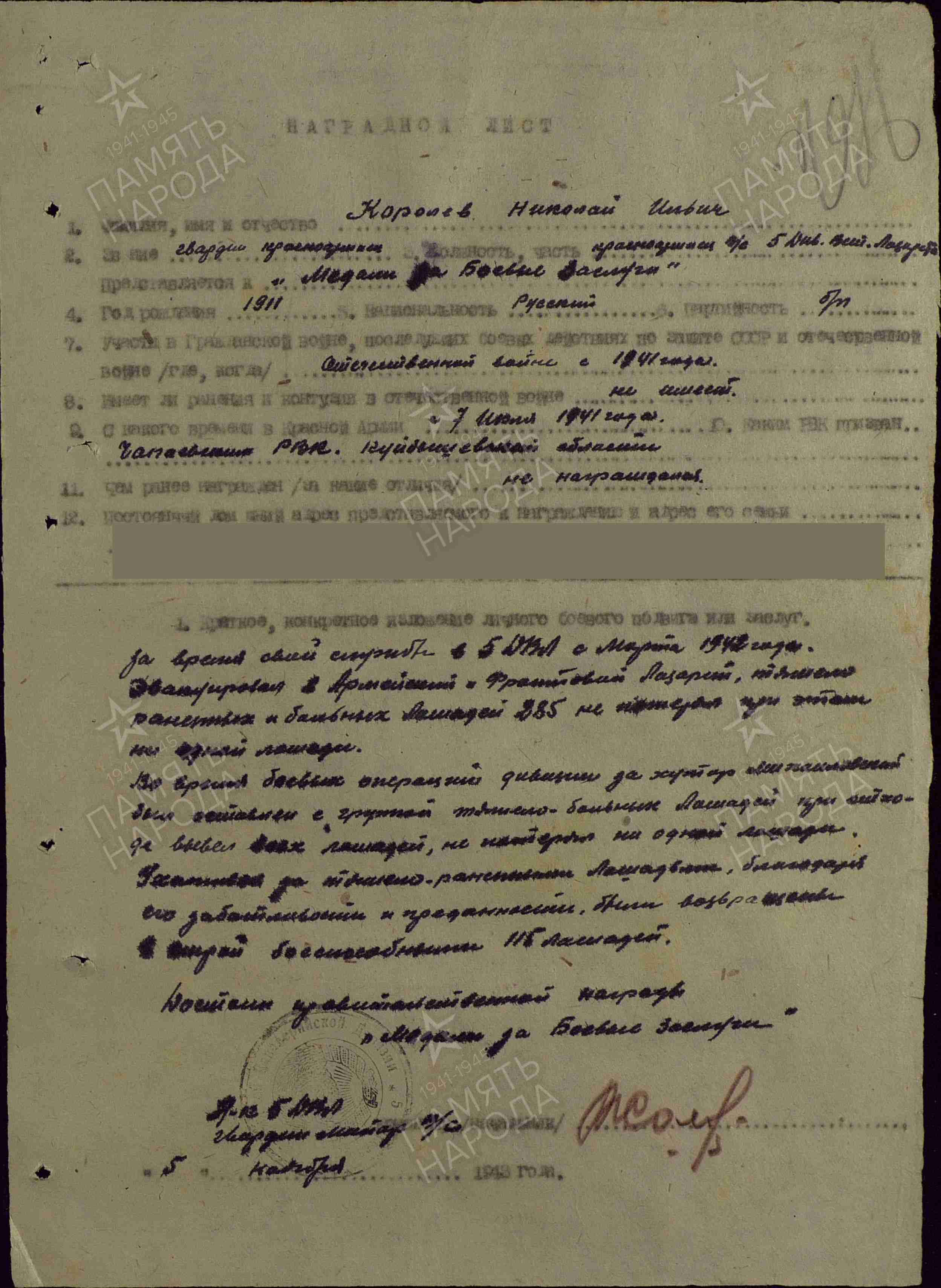 Информация из Наградного листа: «За время своей службы в ДВЛ товарищ Королев выполнял работу по уходу за тяжело раненными и больными лошадьми. Эта работа ему поручалась благодаря его хорошему отношению к конскому составу, добросовестного отношения к порученной работе. В результате его честной службы потери тяжело больных в лазарете был редким. Эффективность лечения больных и раненных были на 98,2%. Группа тяжело-больных лошадей была поручена товарищу Королеву и во время боев за город Берлин, которую он благополучно доставил в район расположения ДВЛ до реки Эльбы без потерь. Достоин правительственной награды медали «За отвагу» (решением командования награжден медалью «За боевые заслуги»).