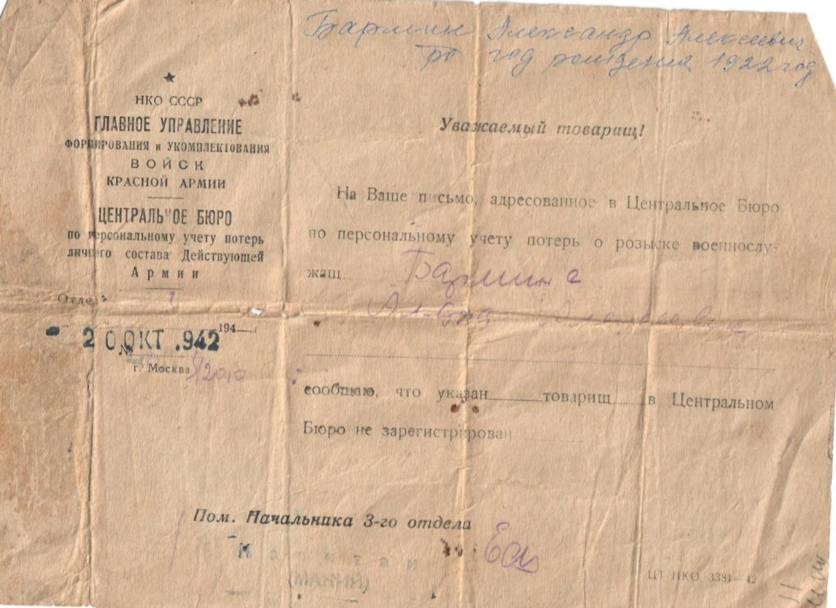Когда началась Великая Отечественная война, Александру было всего 19 лет. Вместе с отцом, Барминым Алексеем Ивановичем, юноша был призван в ряды Красной Армии на борьбу с немецкими захватчиками.