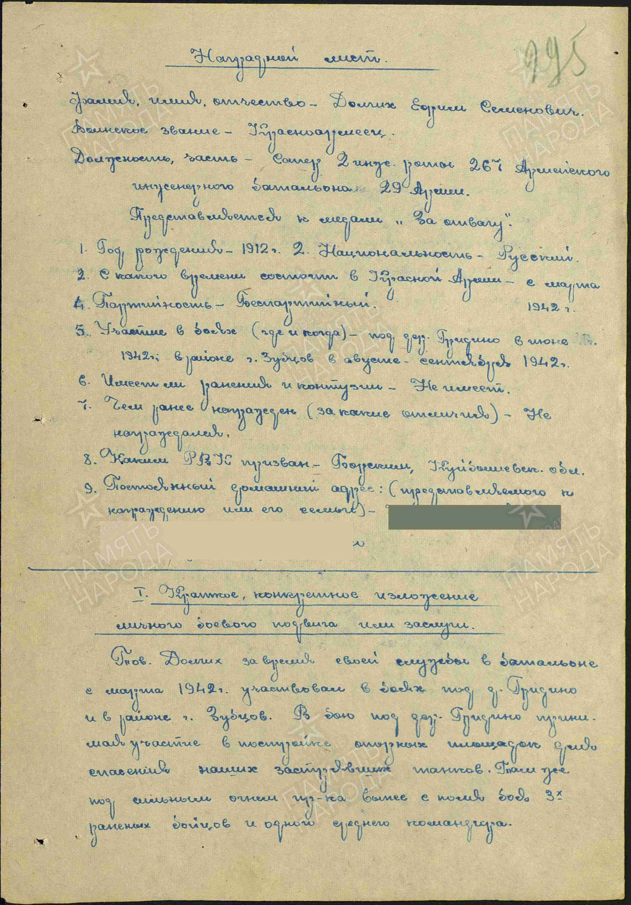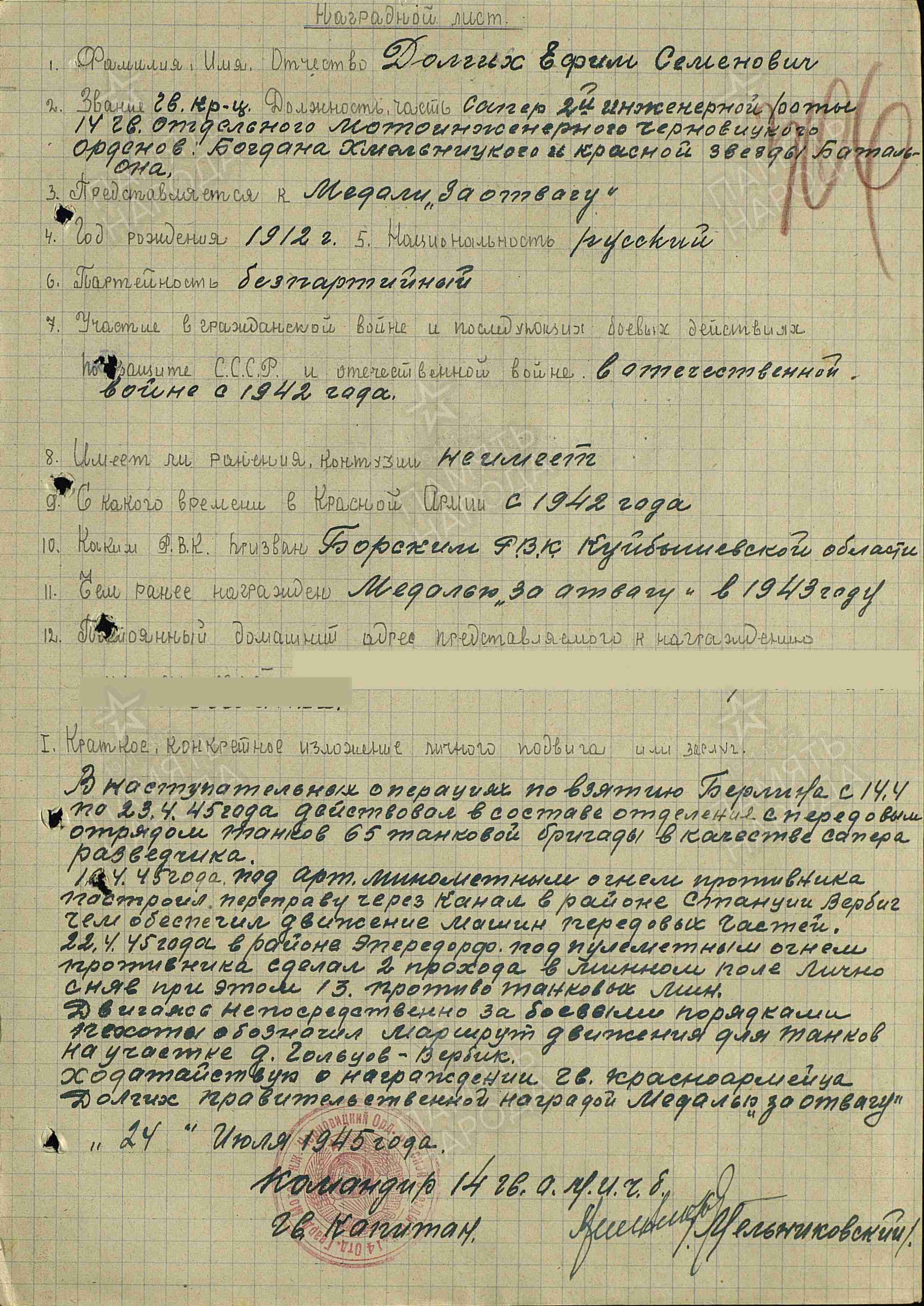 Информация из Наградного листа от 24 июля 1945 г. к медали «За отвагу»: «В наступательных операциях по взятию Берлина с 14.4 по 23.4.45 года действовал в составе отделения с передовым отрядом танков 65 танковой бригады в качестве сапера разведчика. 10.4.45 года под арт. минометным огнем противника построил переправу через канал в районе станции Вербиг, чем обеспечил движение машин передовых частей. 22.4.45 года в районе Эппендорф, под пулеметным огнем противника сделал 2 прохода в минном поле, лично сняв при этом 13 противотанковых мин. двигаясь непосредственно за боевыми порядками пехоты обозначил маршрут движения для танков на участке д. Гольцов – Вербик. Ходатайствую о награждении гв. красноармейца Долгих правительственной наградой медалью «За отвагу».
