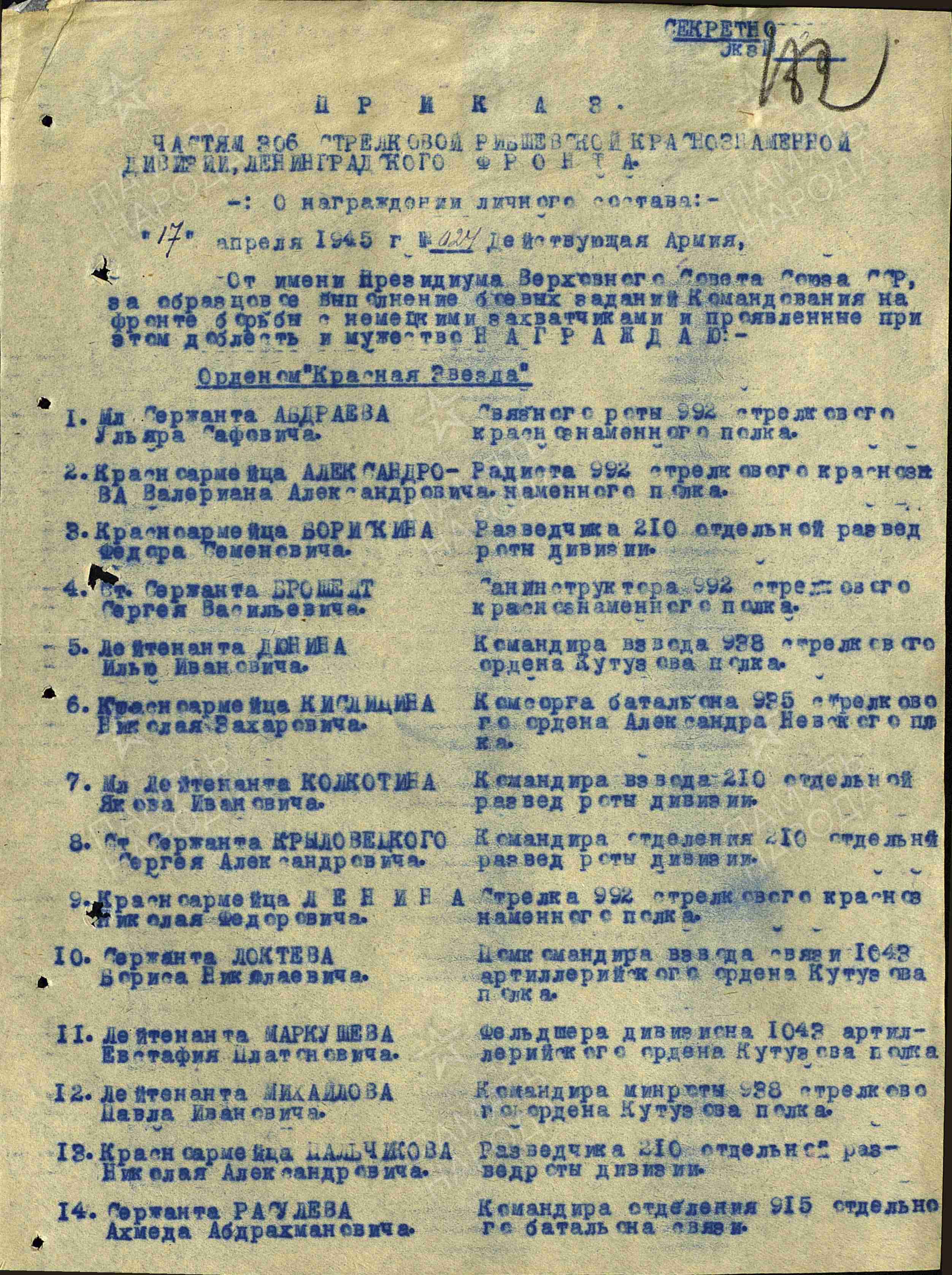 Родился в 1903 году в Джангалинском районе Уральской области, селение Шестой аул. На фронт призван в мае 1942 года Пугачевским РВК Саратовской области. Служил в 63 отдельном понтонно-мостовом батальоне - понтонером. С 1 января 1943 г. по 9 мая 1945 г. служил сапером в составе 240 саперного батальона. Демобилизовался в июле 1945 года.