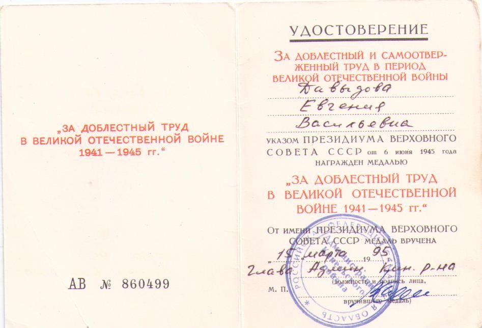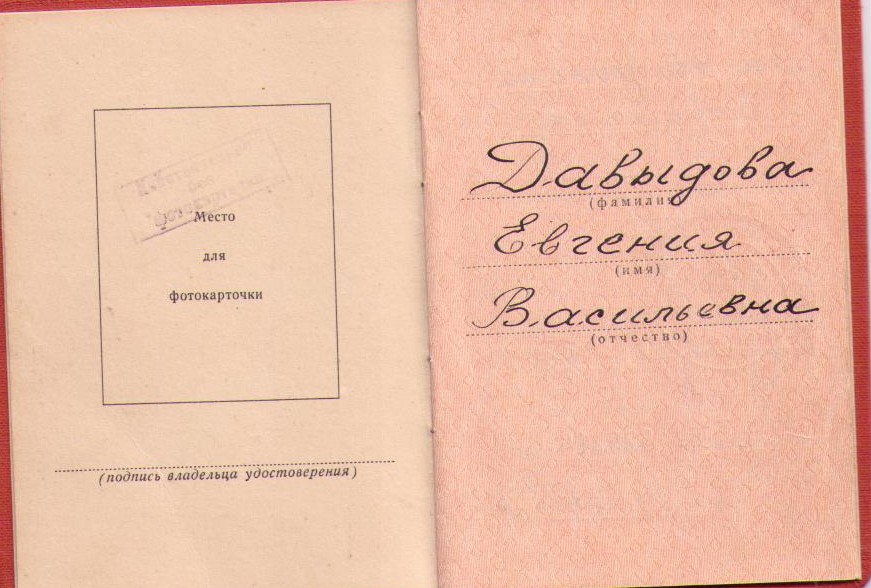 В 1940 году Евгения Васильевна вышла замуж. Её муж Пётр работал в колхозе водителем. Затем Петр завербовался в Свердловск. Евгения Васильевна поехала с мужем. В Свердловске Евгения Васильевна устроилась на металлургический завод подсобной рабочей по переработке рудной смеси – шихты. Всем рабочим выдавали спецодежду: комбинезон, сапоги, рукавицы. Затем её перевели в домноремонтный цех. Работали в цехе женщины и подростки. Бригадиром цеха был Лукин. Рабочие месили глину и таскали её на носилках в доменную печь. Подростки делали деревянные ящики под снаряды. Жили Давыдовы в деревянном бараке, как и все заводчане. На полу вместо досок лежали опилки. Перед самой войной Петра забрали на сборы. Он так и не увидел свою дочь Нину, которая вскоре после этого появилась на свет. Тяжелый изнурительный труд в цеху, скудный хлебный паёк. Обед в заводской столовой состоял из жидкого супа с редькой вместо картошки. 400 граммов хлеба, которые давали на ребёнка, Евгения Васильевна меняла на молоко. И всё время ждала весточки с фронта, писала письма, запросы. Через два года ей сообщили, что Пётр пропал без вести.
