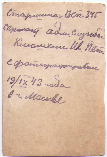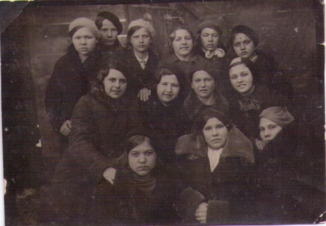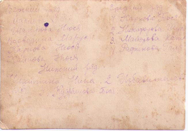 На фотографии, сделанной перед отправкой на фронт, имена подруг (не все фамилии прочитываются): Воеводина Маруся, Карпова Нюся, Никитина Нина, Кудряшова Тося, Рафикова Галя, Майорова Катя, Никифорова Шура, Карпова Тося…