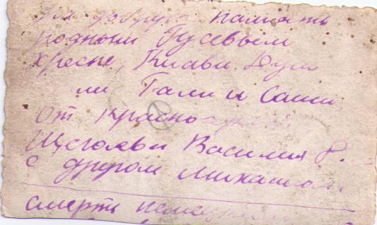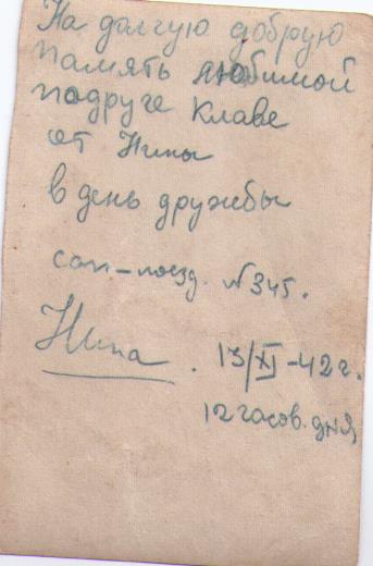 Клавдия Гусева (по мужу Моисеева) родилась в 1920 году. Всю войну была санитаркой в военном поезде. Сохранились фотографии военного периода, на обороте которых есть имена и фамилии солдат: Раиса Андреевна Перепелица, Клюшкин Иван Петрович, неизвестная Шура Ш., подруга по ВСП №345 Нина, Борискин Василий, Щеголев Василий.