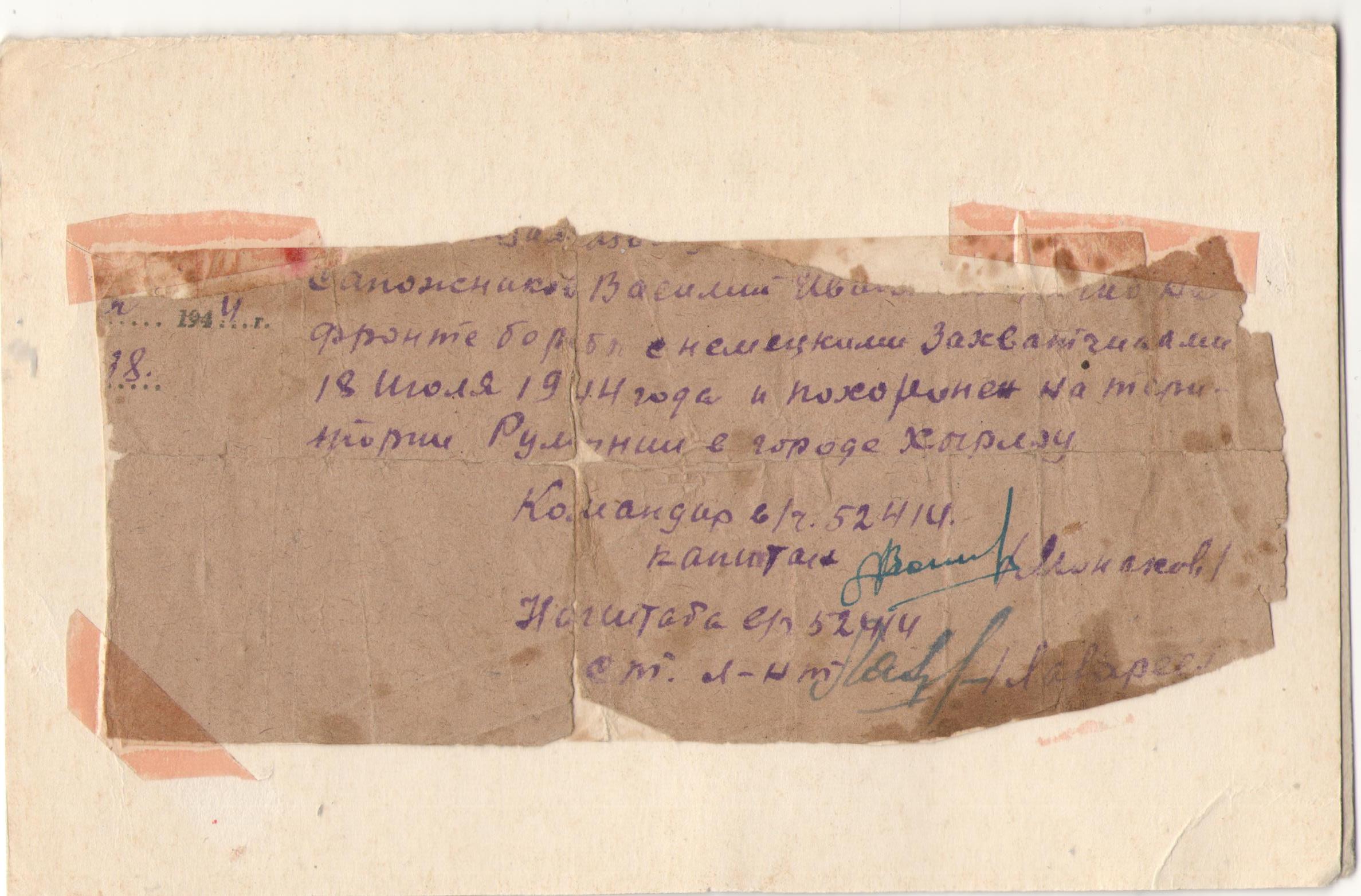 Родился в 1926 году в селе Красная Самарка Утевского (ныне Кинельского) района Самарской области. Ушёл на фронт в начале 1944 года. Дошёл до Румынии. Из воспоминаний матери: «От Васи было всего два письма. В первом писал, что находится в Румынии. Жив, здоров. Но ходить по одному не разрешают, опасаются местных жителей. Распечатала второе письмо, а там извещение о гибели Василия». В извещении было написано: «Сапожников Василий Иванович погиб на фронте борьбы с немецкими захватчиками 18 июля 1944 года и похоронен на территории Румынии в городе Хырлэу». Извещение подписано командиром в/ч 52414 капитаном Монаховым и начштабом старшим лейтенантом Лаваревым.