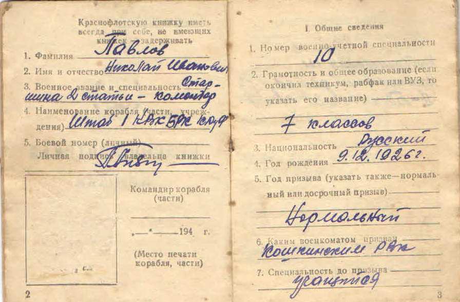 Николай Павлов родился 9 декабря 1926 г в селе Нижняя Быковка Кошкинского района Куйбышевской области. Был призван на службу Кошкинским РВК в 1943 году. С 24 ноября 1943 г. проходил службу в объединенной школе Краснознаменного Амурского флота, после окончания которой он попал на фронт.