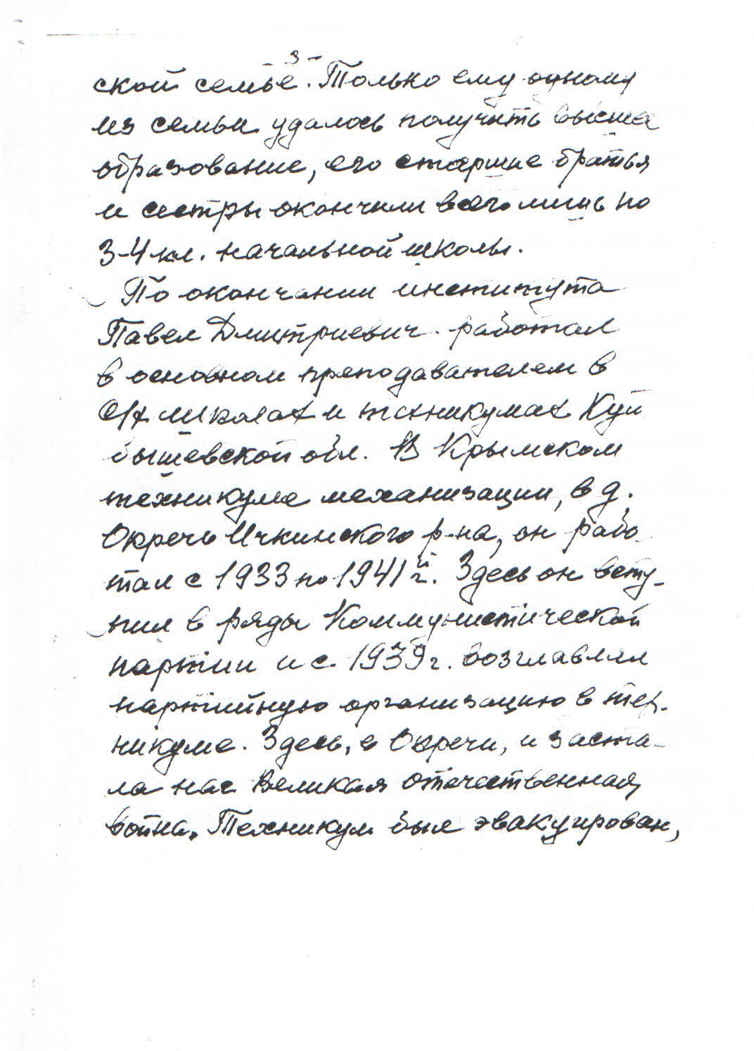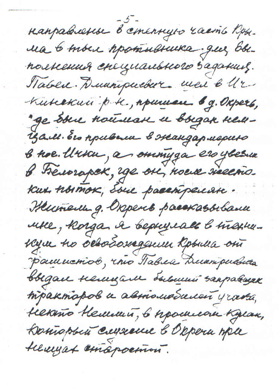 Здесь, в Окречи, и застала его с семьей война. Техникум был эвакуирован, а его директор Михаил Ильич Чуб остался в Крыму для организации Ичкинского партизанского отряда, прославившегося в боях с врагом. Жена Павла Дмитриевича выехала с матерью в Куйбышевскую область, а Павел Дмитриевич в конце октября 1941 г. ушел в лес, в партизанский отряд. Был политруком группы, парторгом отряда. В сентябре 1942 г., выполняя боевое задание, Павел Дмитриевич погиб (по доносу предателя был выдан немцам и после жестоких пыток расстрелян). Об этом родные узнали из письма, которое прислал жене героя командир партизанского отряда Михаил Ильич Чуб в 1944 году.