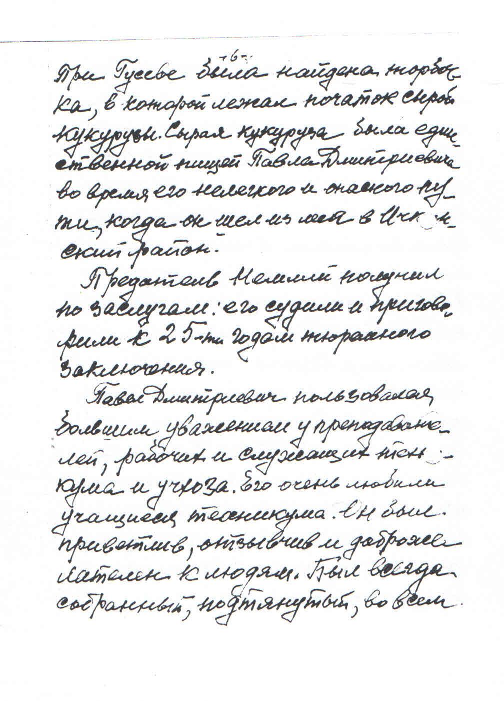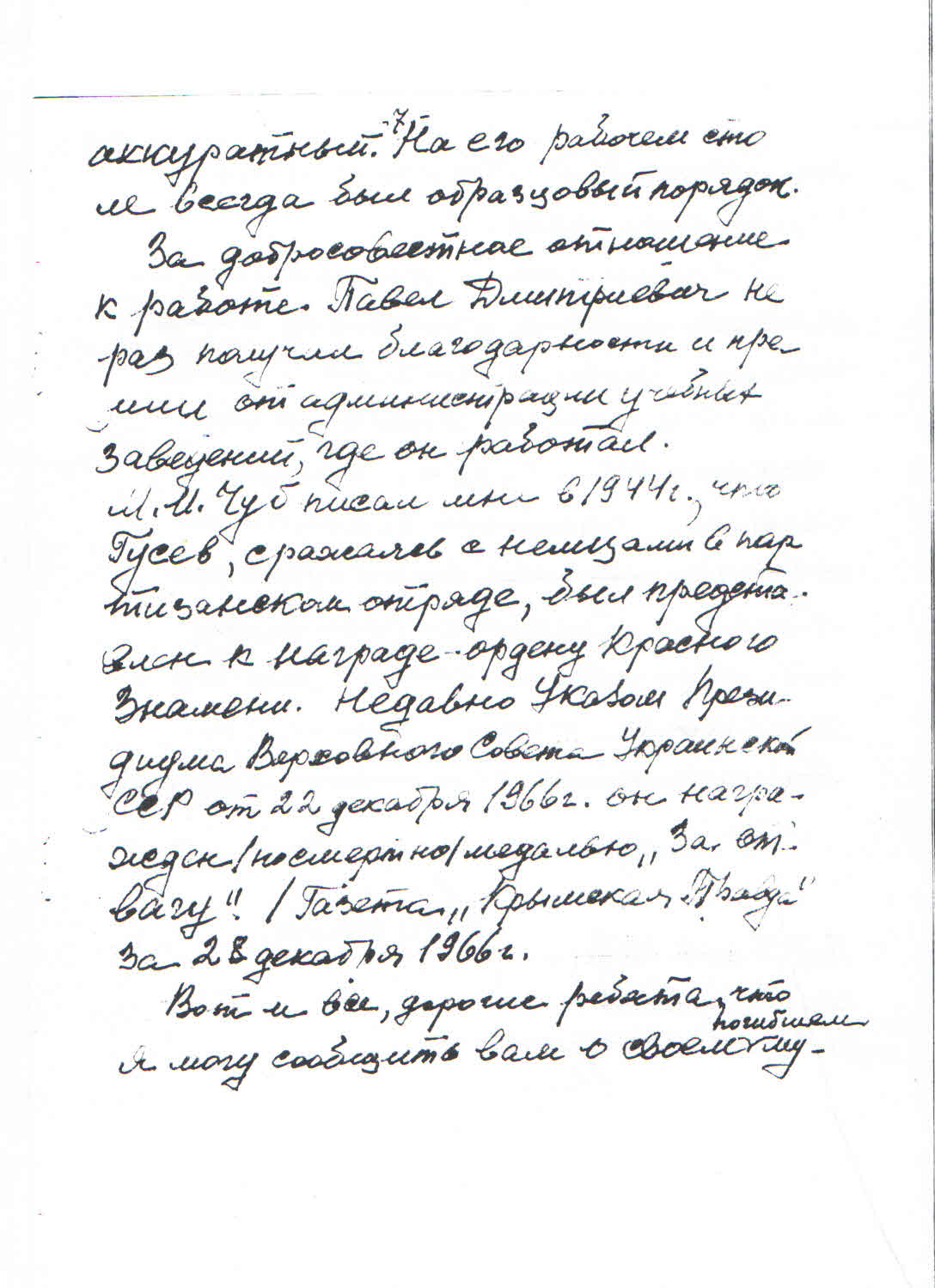 За мужество и отвагу Павел Дмитриевич посмертно награжден медалью «За отвагу». В январе 1967 года жена Павла Дмитриевича отправила ответное письмо красным следопытам Заветненской средней школы, которые собирали материалы для музея боевой славы Ичкинского партизанского отряда, в котором рассказала факты биографии своего мужа.