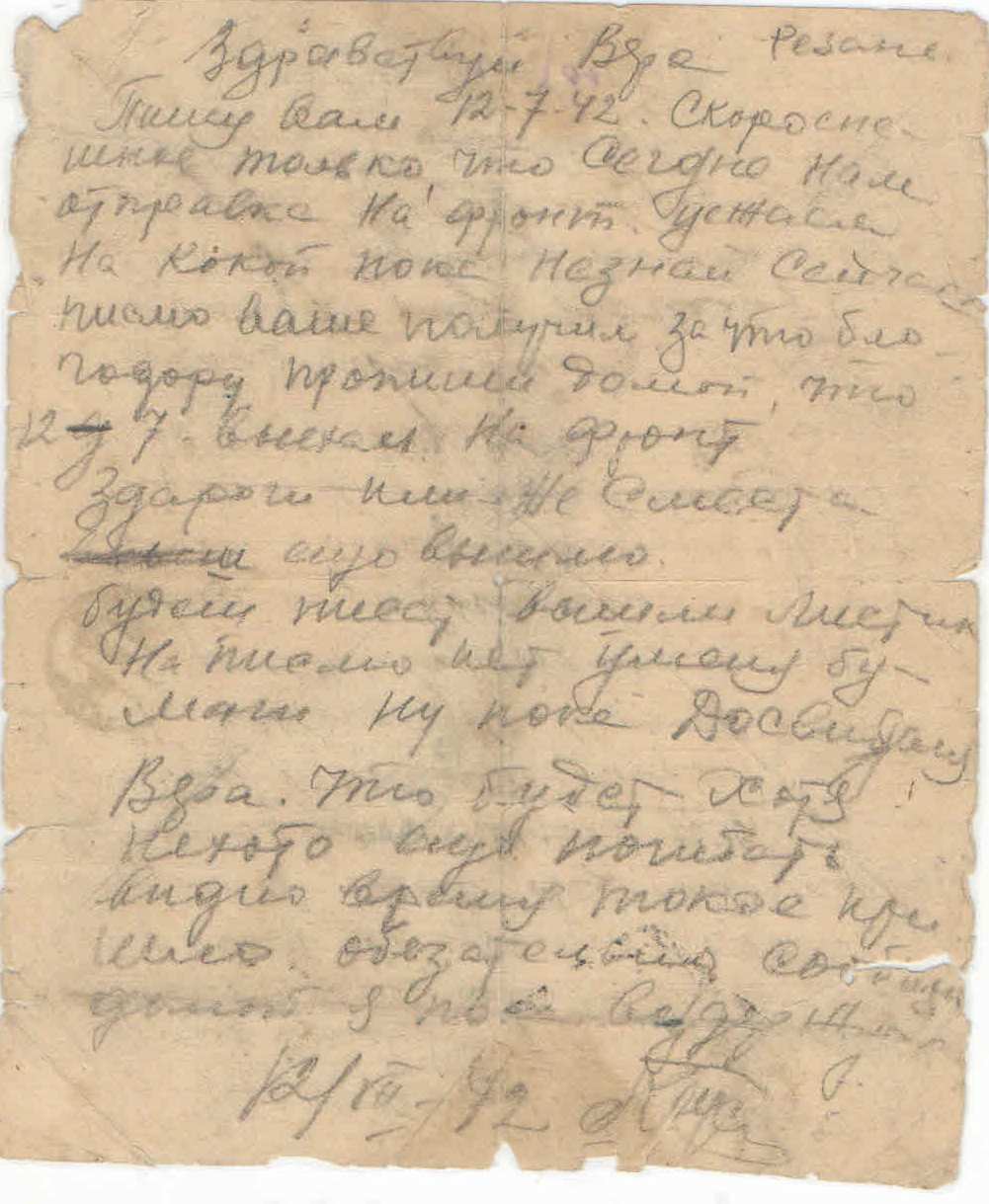 Сохранилось его письмо дочери Вере, отправленное из Рязани: «Здравствуй, Вера. Пишу вам 12.7.42 скороспешное. Только что сегодня нам отправка на фронт уезжаем. На какой пока не знаем. Сейчас письмо ваше получил, за что благодарю. Пропиши домой, что 12-7 выехал на фронт. С дороги или же с места еще вышлю. Будешь писать. вышли листик. На письмо нет у меня бумаги. Ну пока. До свидания, Вера. Что будет. Хотя неохота еще погибать, видно время такое пришло. Обязательно напиши домой, я пока воздержусь. 12.07.42 (подпись) К. Гусев»