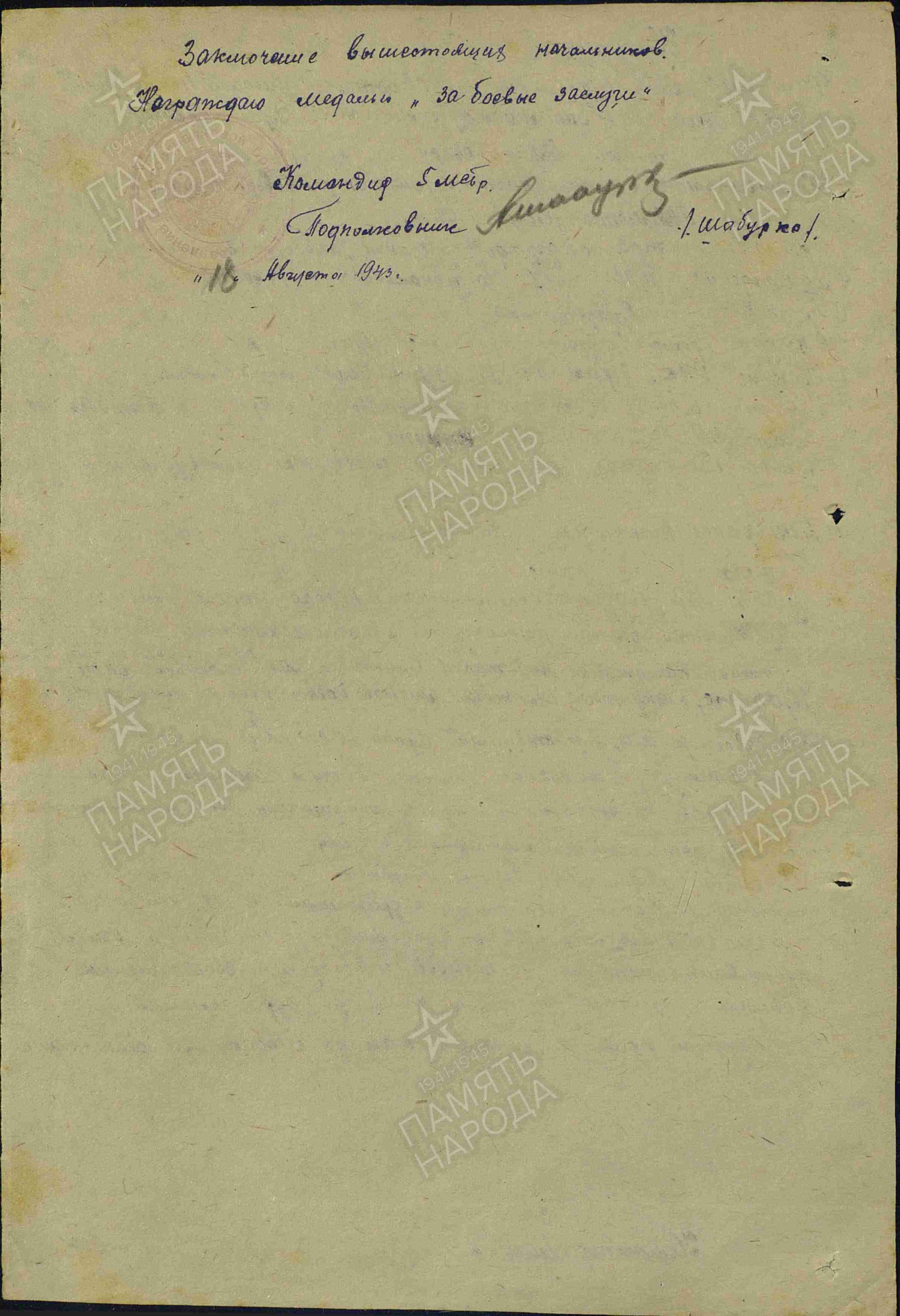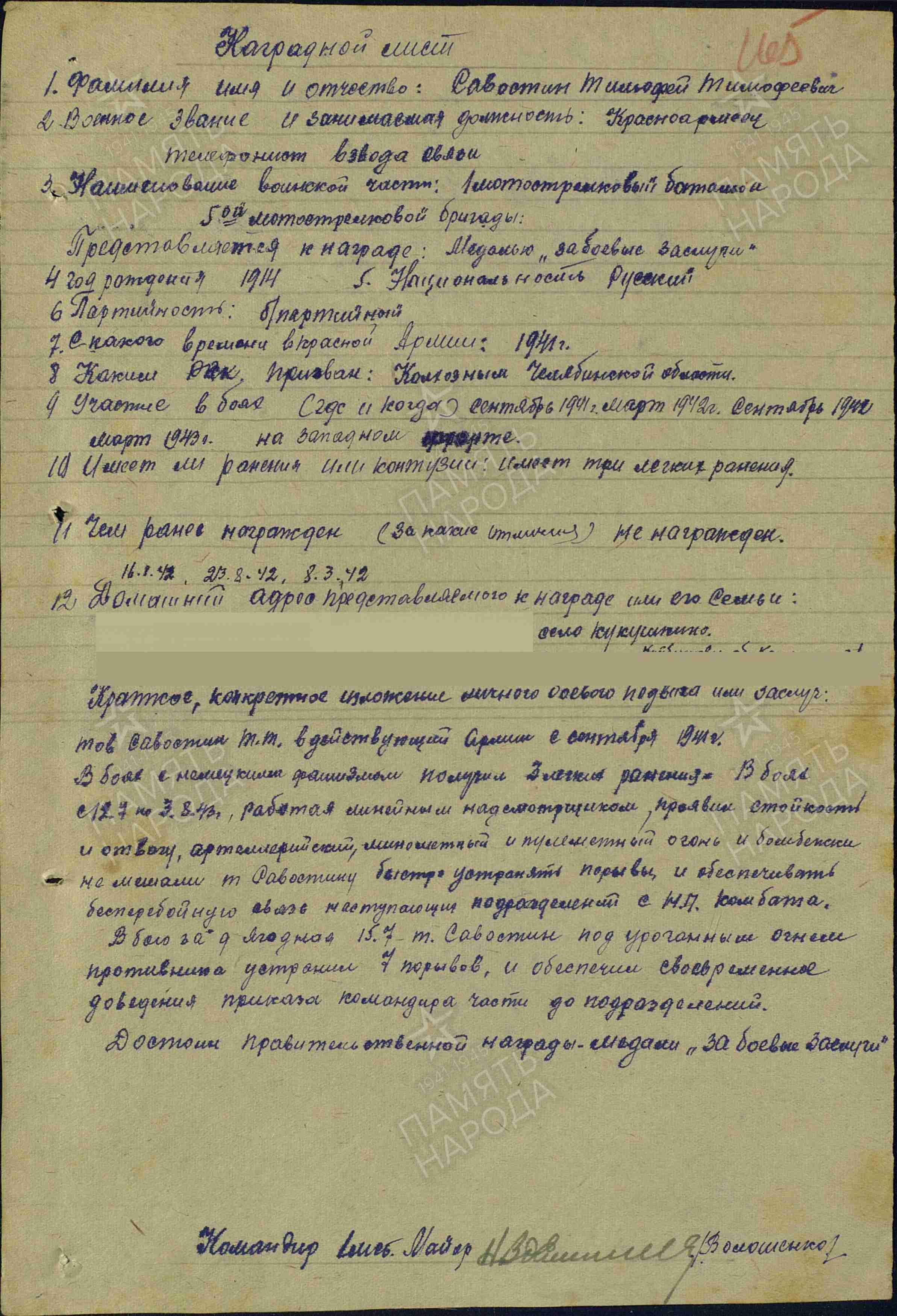 Савостин Т. Т. Наградной лист к медали «За боевые заслуги» (2 стр.)