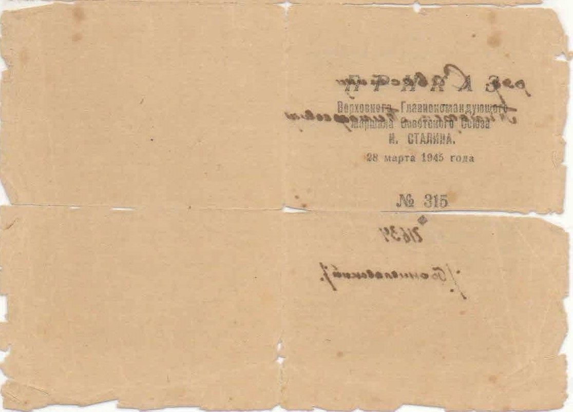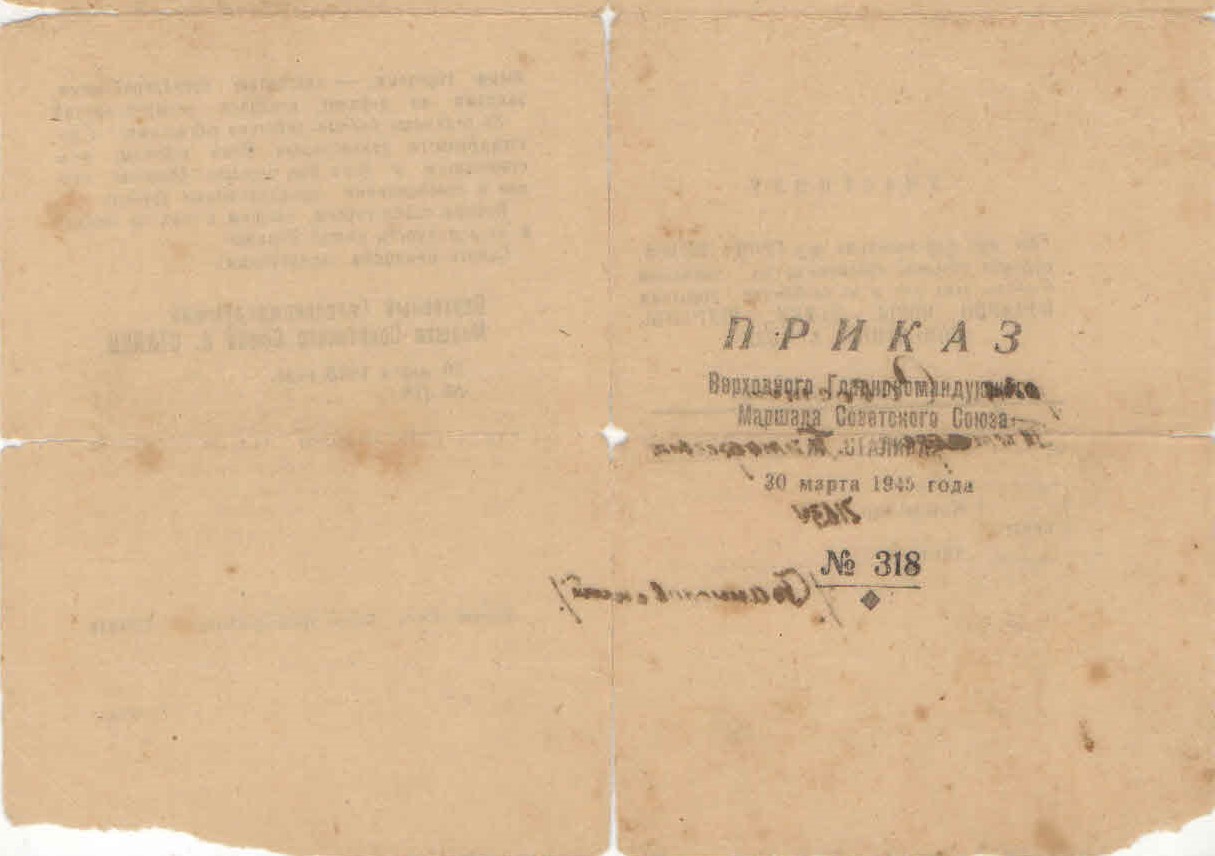Савостин Т. Т. Приказ Верховного Главнокомандующего от 30 марта 1945 г. №318 (4 стр.)
