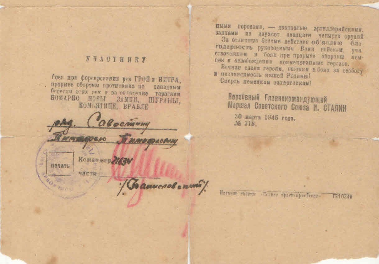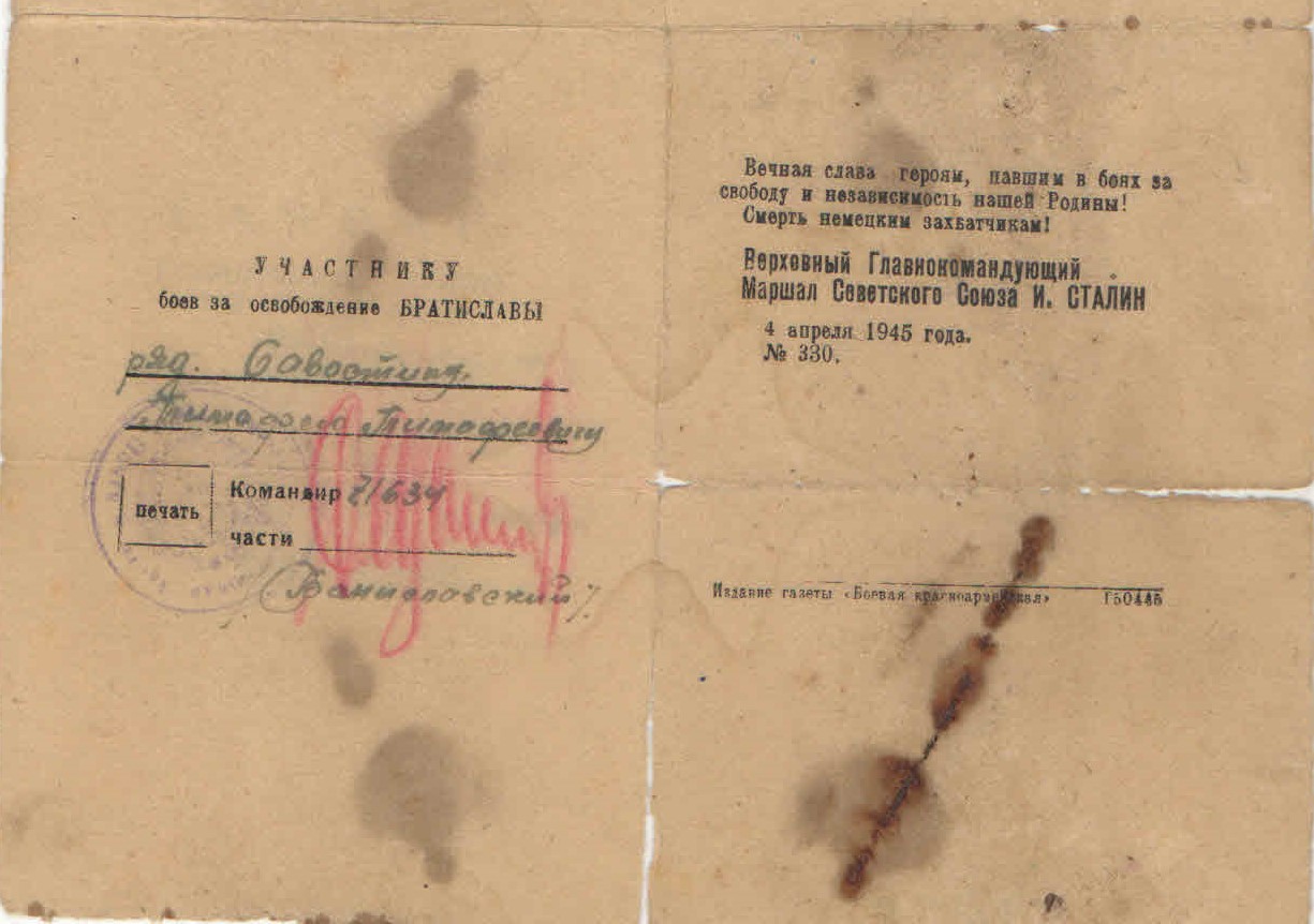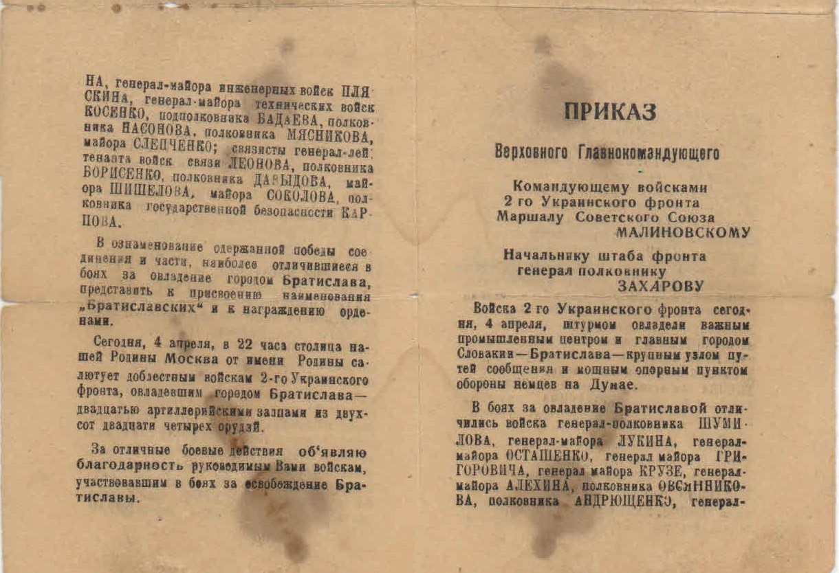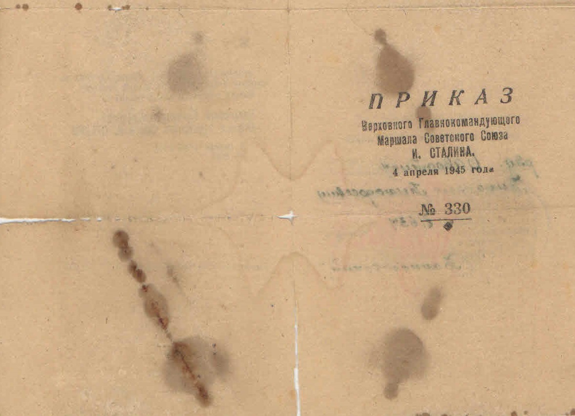 Савостин Т. Т. Приказ Верховного Главнокомандующего от 4 апреля 1945 г. №330 (4 стр.)