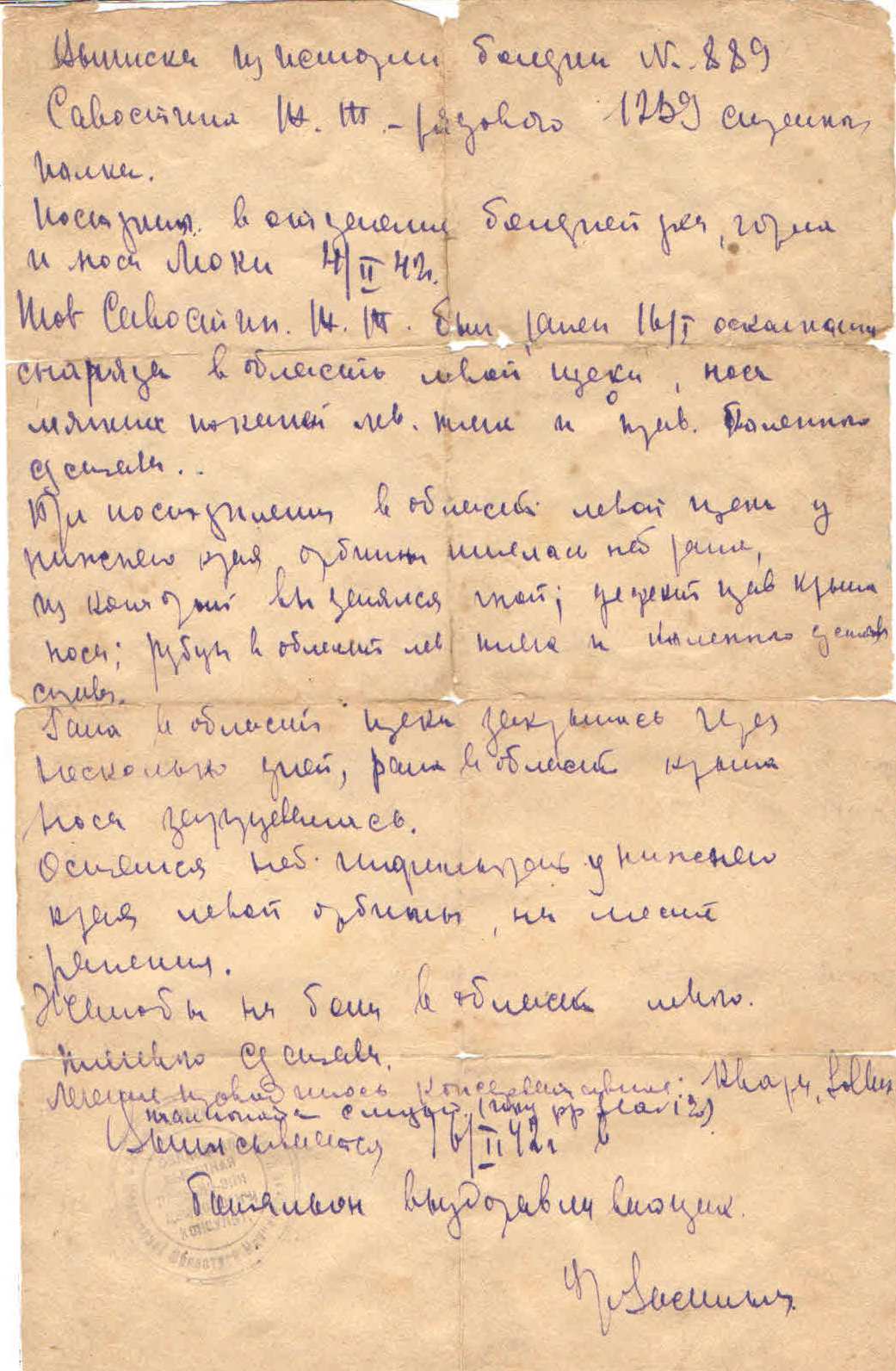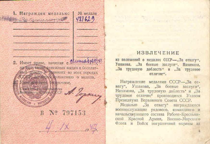 Савостин Т. Т. (в документе ошибочно указано другое отчество) Удостоверение к медали «За боевые заслуги» (2 стр.).