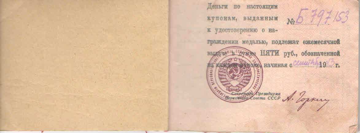 Савостин Т. Т. Купоны на денежные выплаты к удостоверению о награждении медалью, 1943 г. (2 стр.)