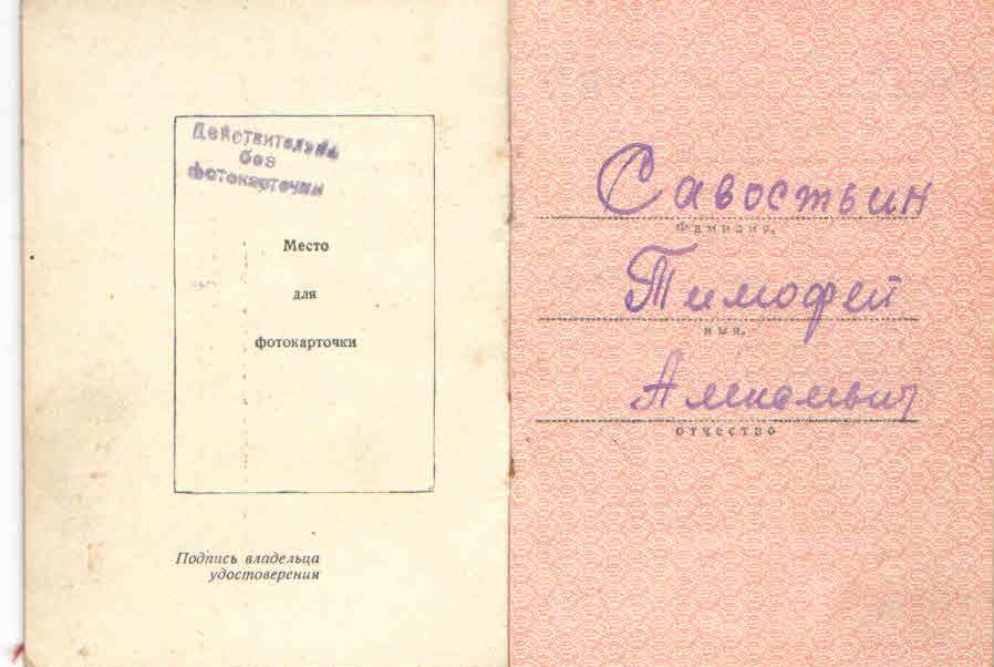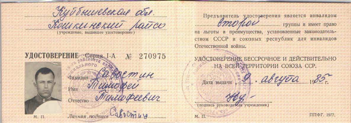 Савостин Т. Т. Удостоверение инвалида Великой Отечественной войны