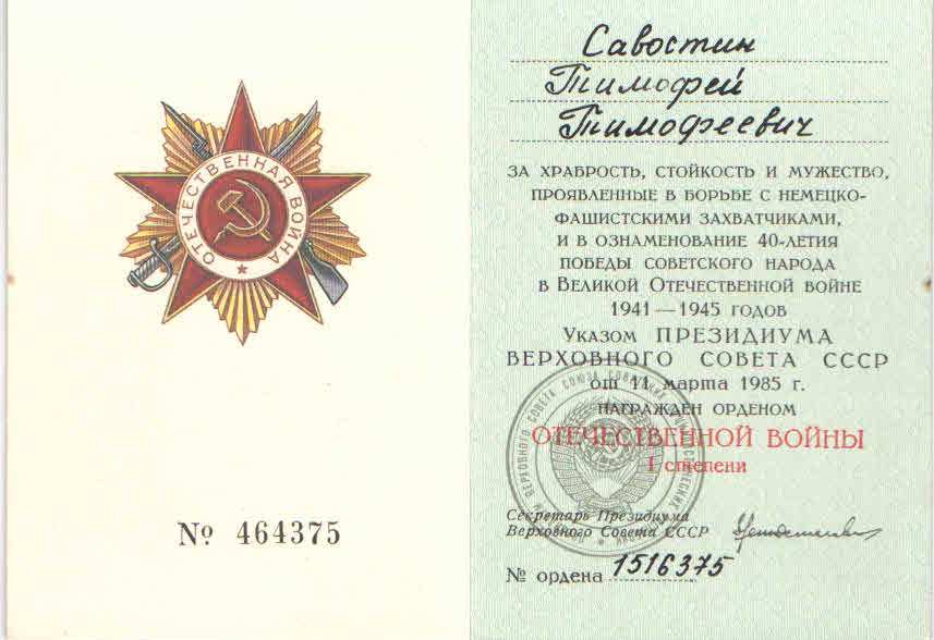 Савостин Т. Т. Наградная книжка к ордену Отечественной войны I степени, 1985 г.