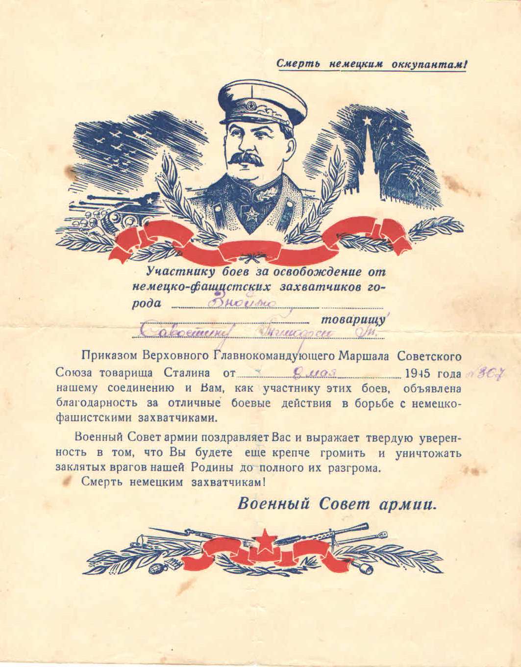 Савостин Т. Т Благодарность от 8 мая 1945 г.