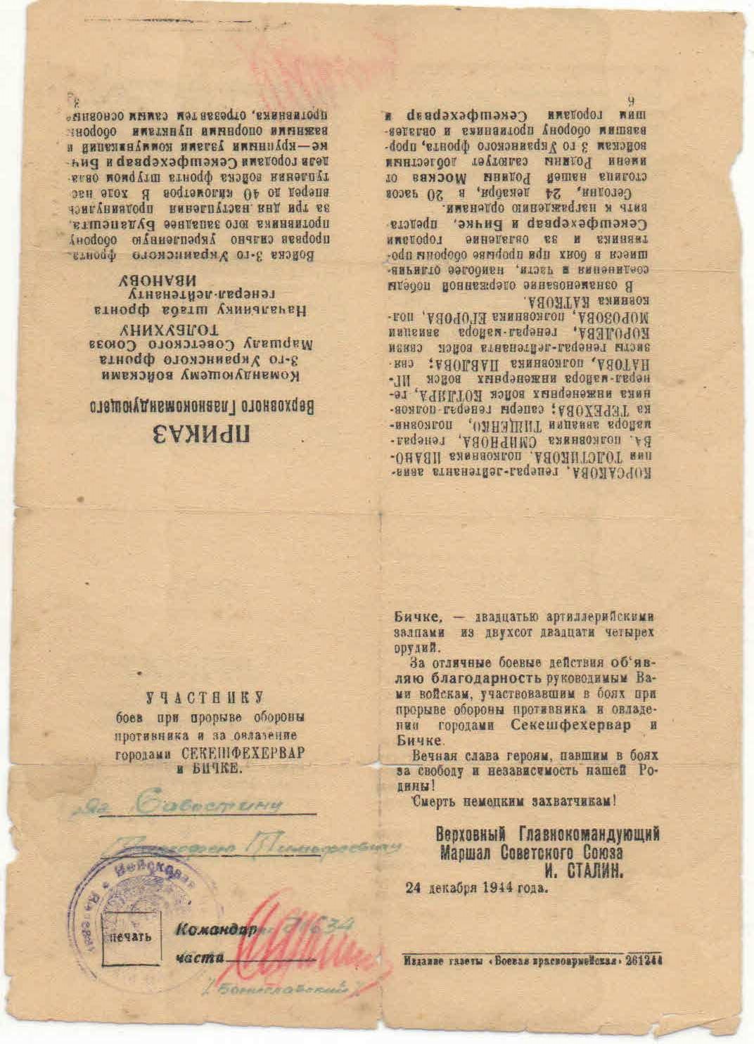 Савостин Т. Т Приказ Верховного Главнокомандующего от 24 декабря 1944 г. (2 стр.)