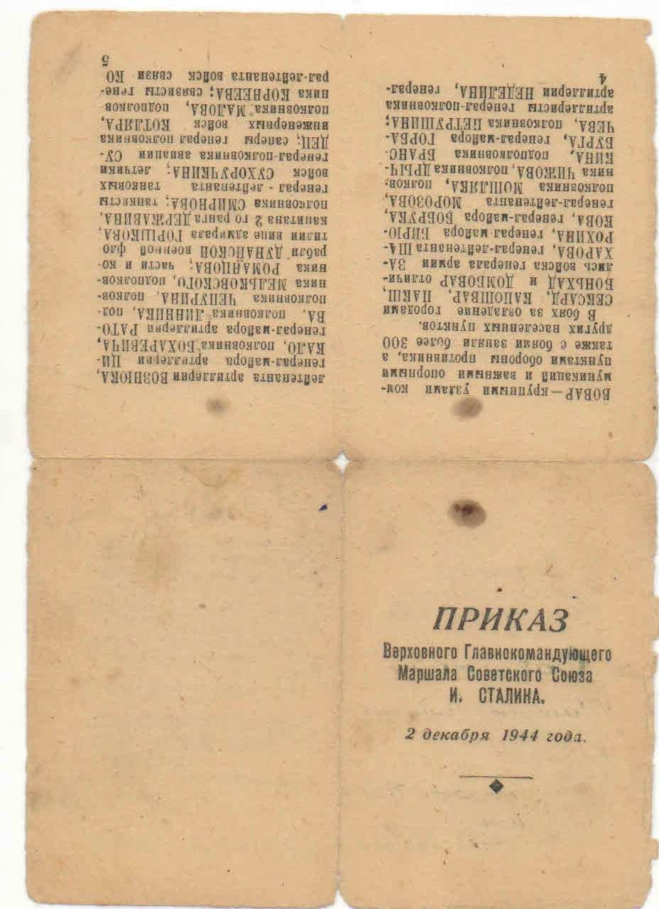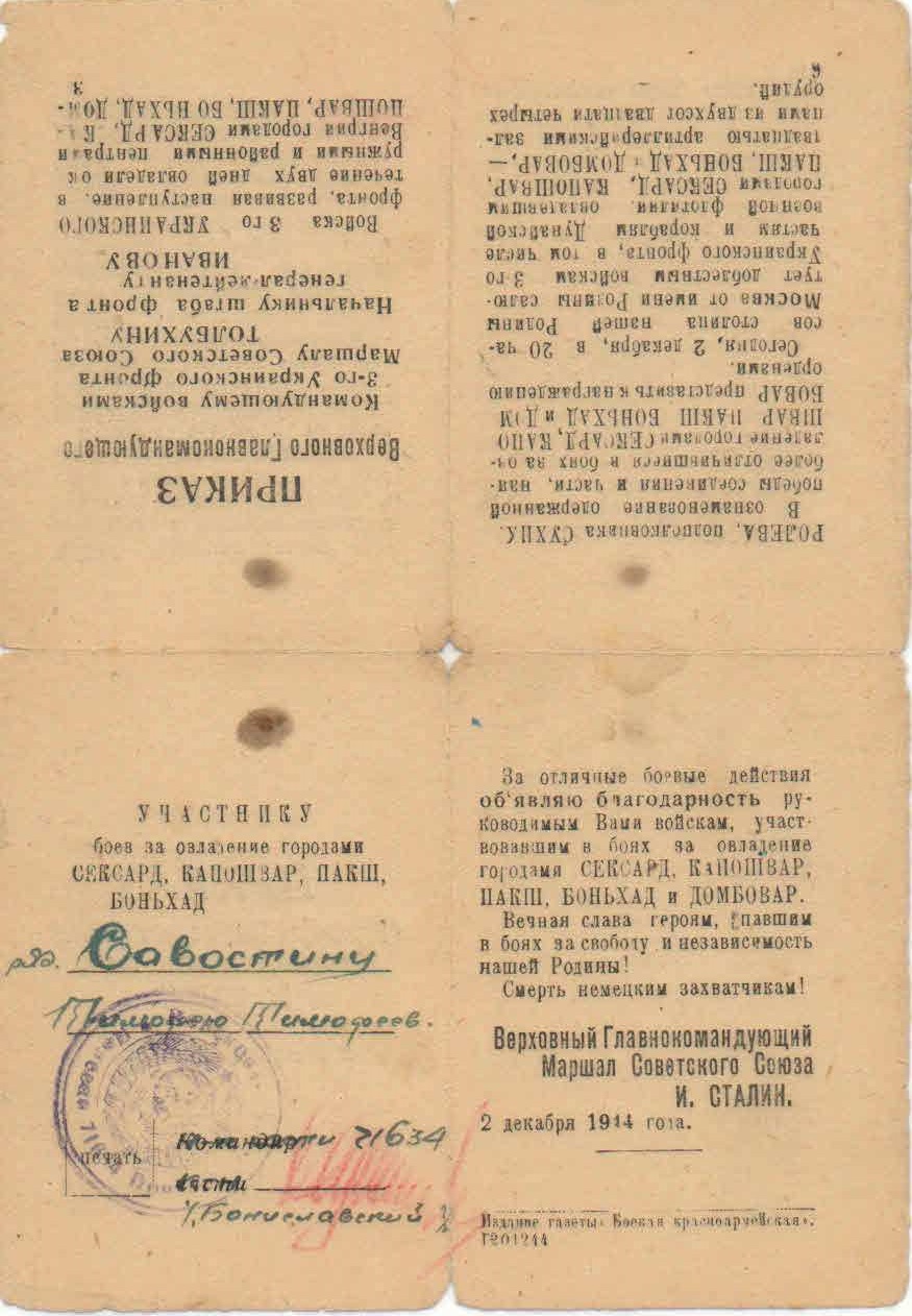 Савостин Т. Т. Приказ Верховного Главнокомандующего от 2 декабря 1944 г. (2 стр.)