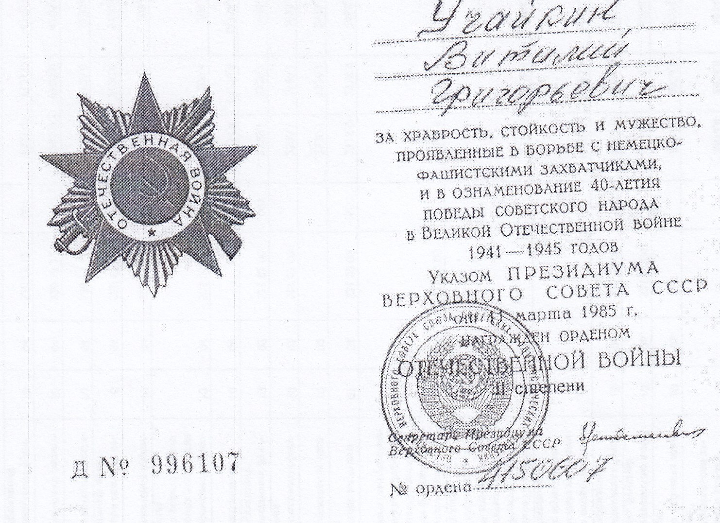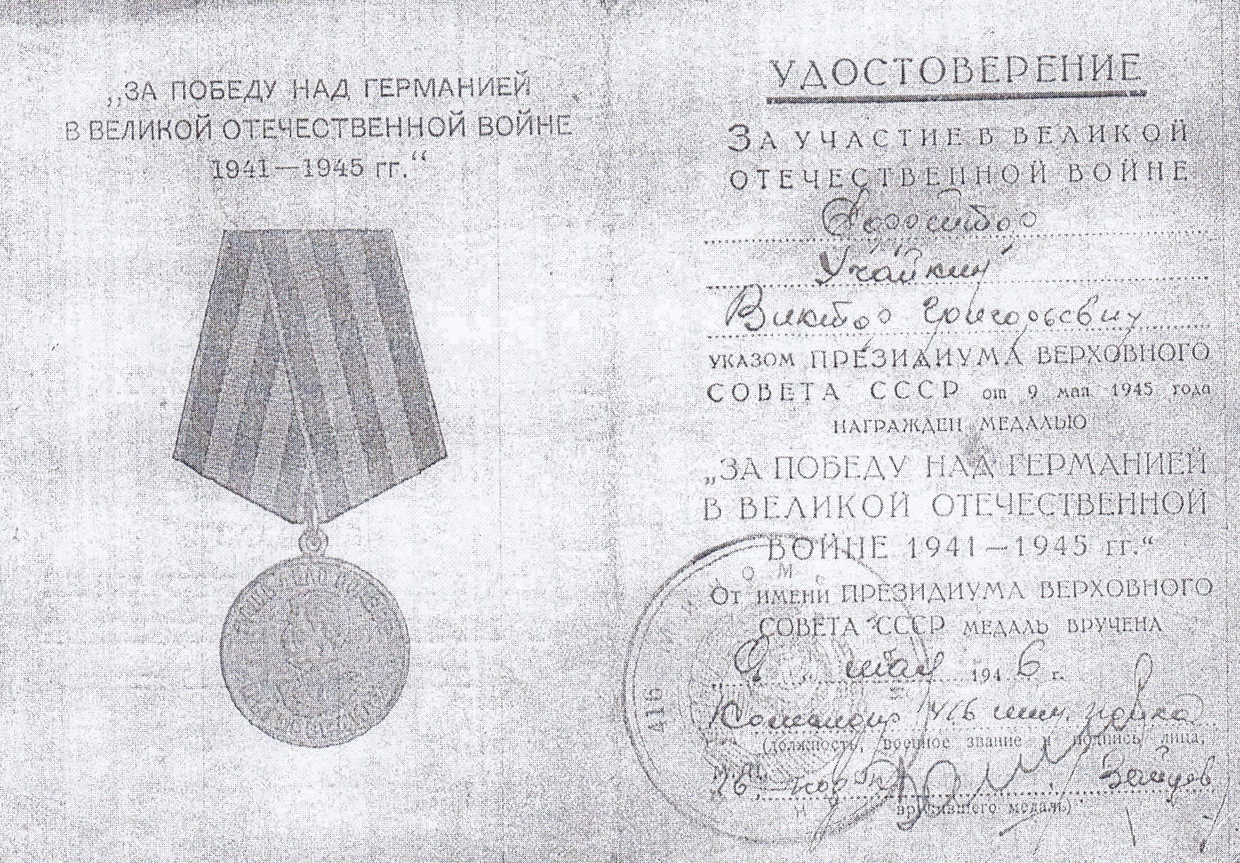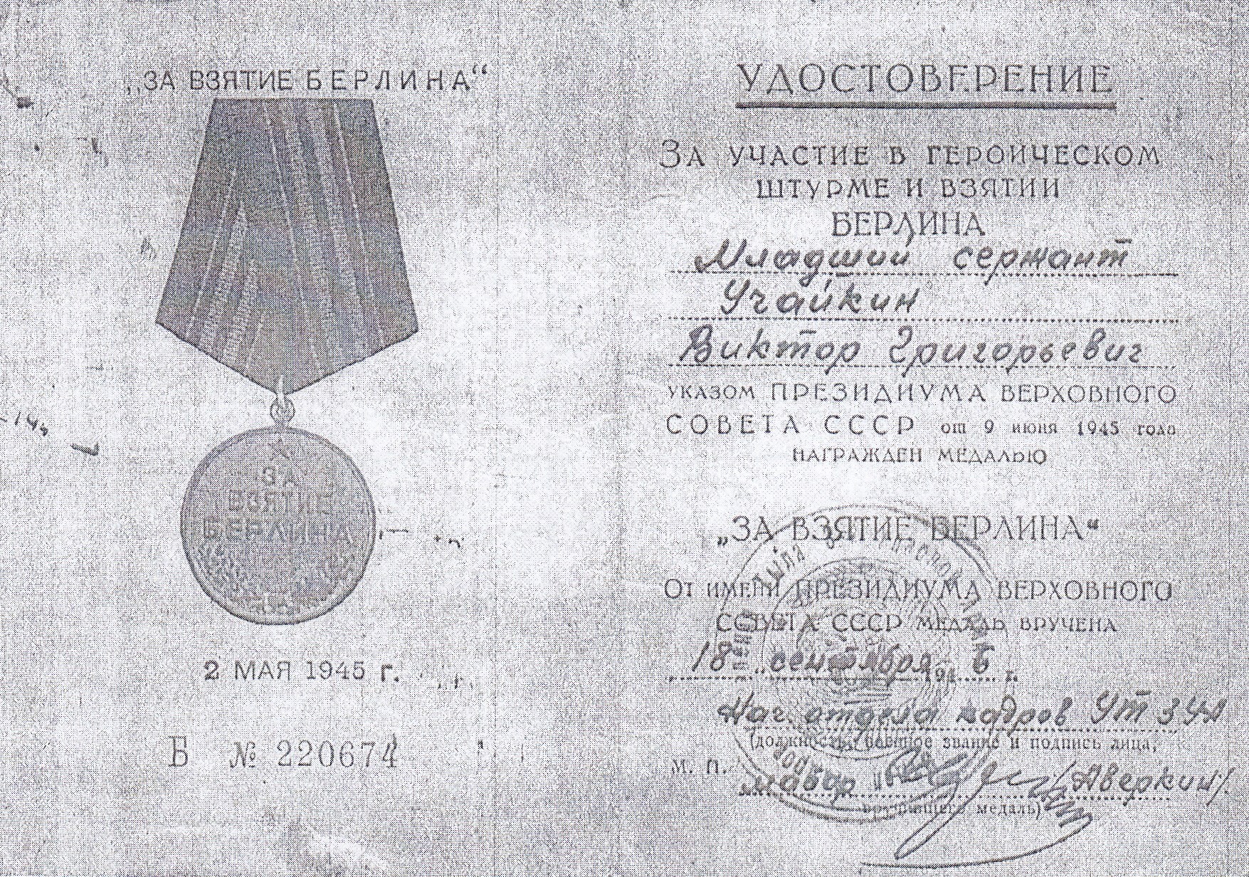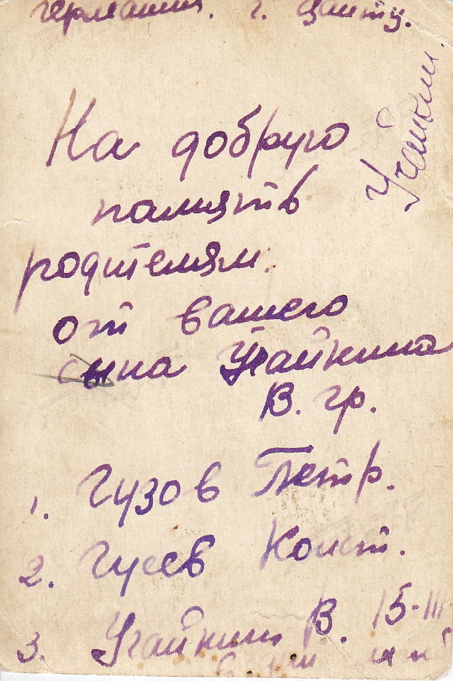 Виталий Учайкин родился 25 апреля 1926 г. в селе Чубовка Кинельского района Куйбышевской области. Призван на действительную военную службу в 1943 году. Воевал на 1-м Белорусском фронте, был ранен. Дошёл до Берлина. Участвовал во взятии Рейхстага. Закончил войну в звании ефрейтора, воинская часть: 416 минп 46 минбр. Победу встретил в Германии, где и продолжил службу в специальных войсках по охране границы. Демобилизовался в 1951 году. На одной из фотографий, сделанных после победы в Германии, Виталий Учайкин запечатлен с фронтовыми друзьями – Петром Гузовым и Константином Гусевым.
