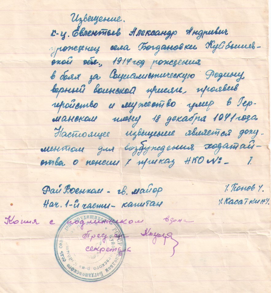 На фронт Александр Андреевич, уезжал вместе со своими друзьями: Никитиным Петром из Богдановки и Климиным Иваном из Путиловки Кинельского района. До войны они вместе работали трактористами, все погибли, защищая Родину.
