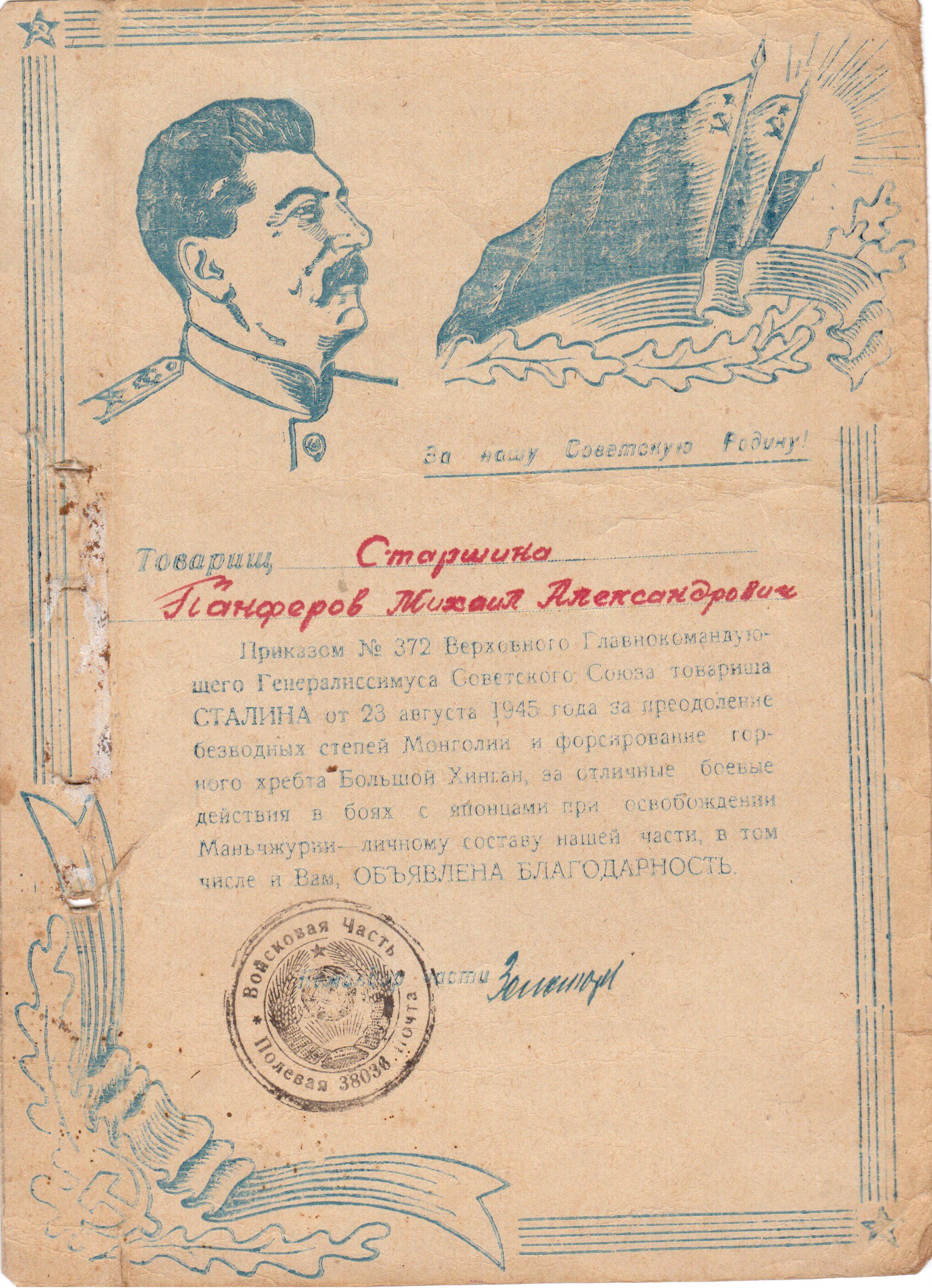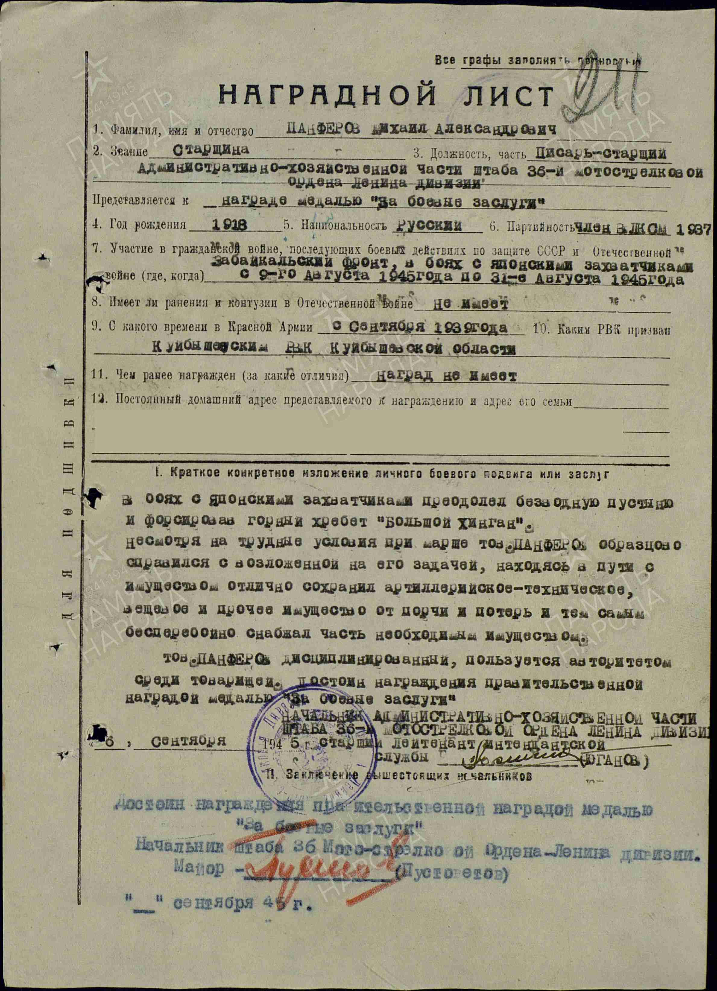 Михаил Панферов родился в селе Георгиевка в 1918 г. В 1939 г призван на службу в ряды Красной Армии. Попал служить на Дальний Восток. Всю войну охранял рубежи нашей Родины. Был старшим писарем. Участвовал в войне с Японией, в боях с японскими захватчиками преодолел безводную пустыню и форсировал горный хребет «Большой Хинган». Несмотря на трудные условия, сохранил имущество от порчи и потерь и тем самым бесперебойно снабжал часть всем необходимым.