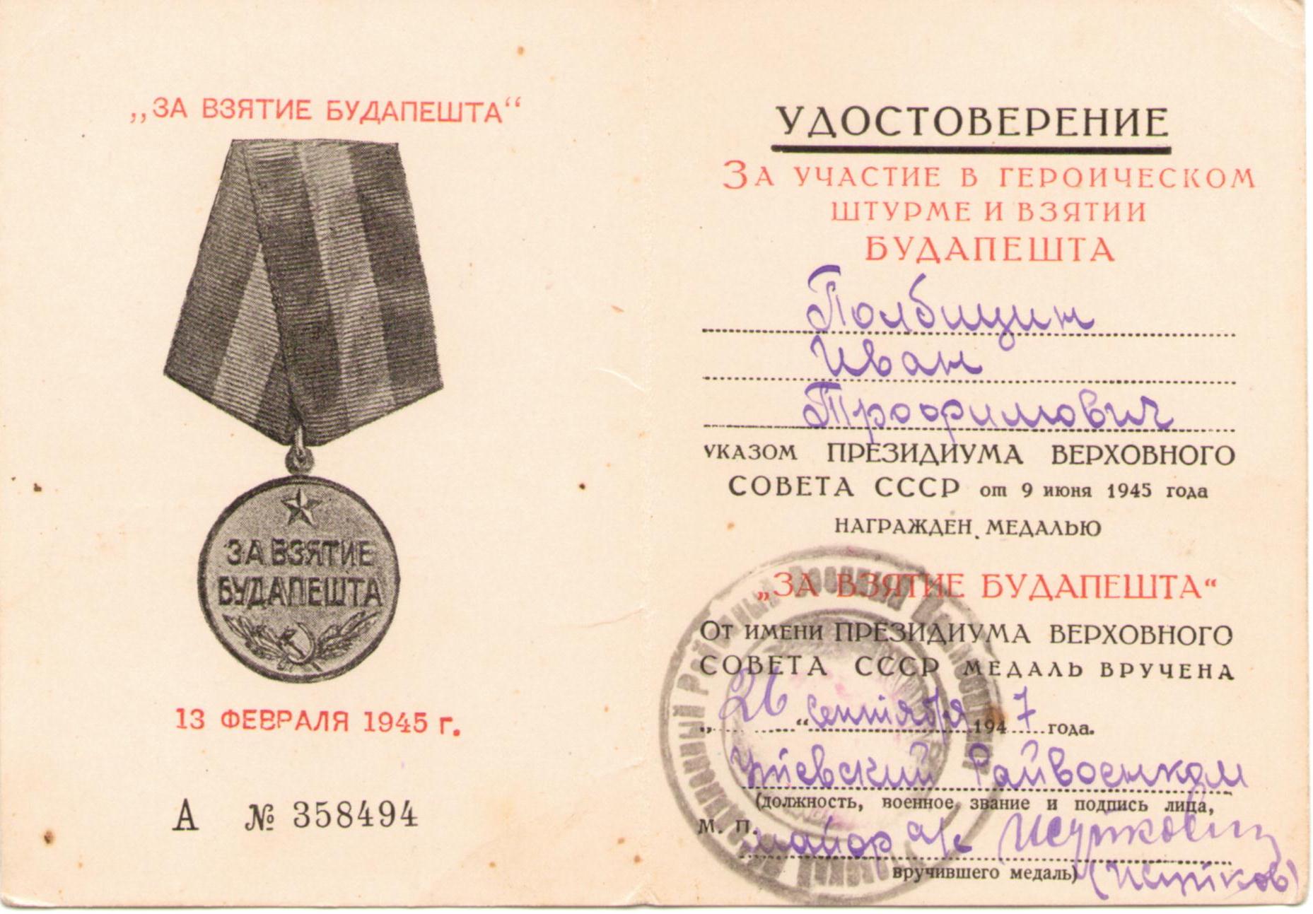 Полбицын И.Т. Удостоверение к медали «За взятие Будапешта», медаль вручена 26 сентября 1947 г. (2 стр.)