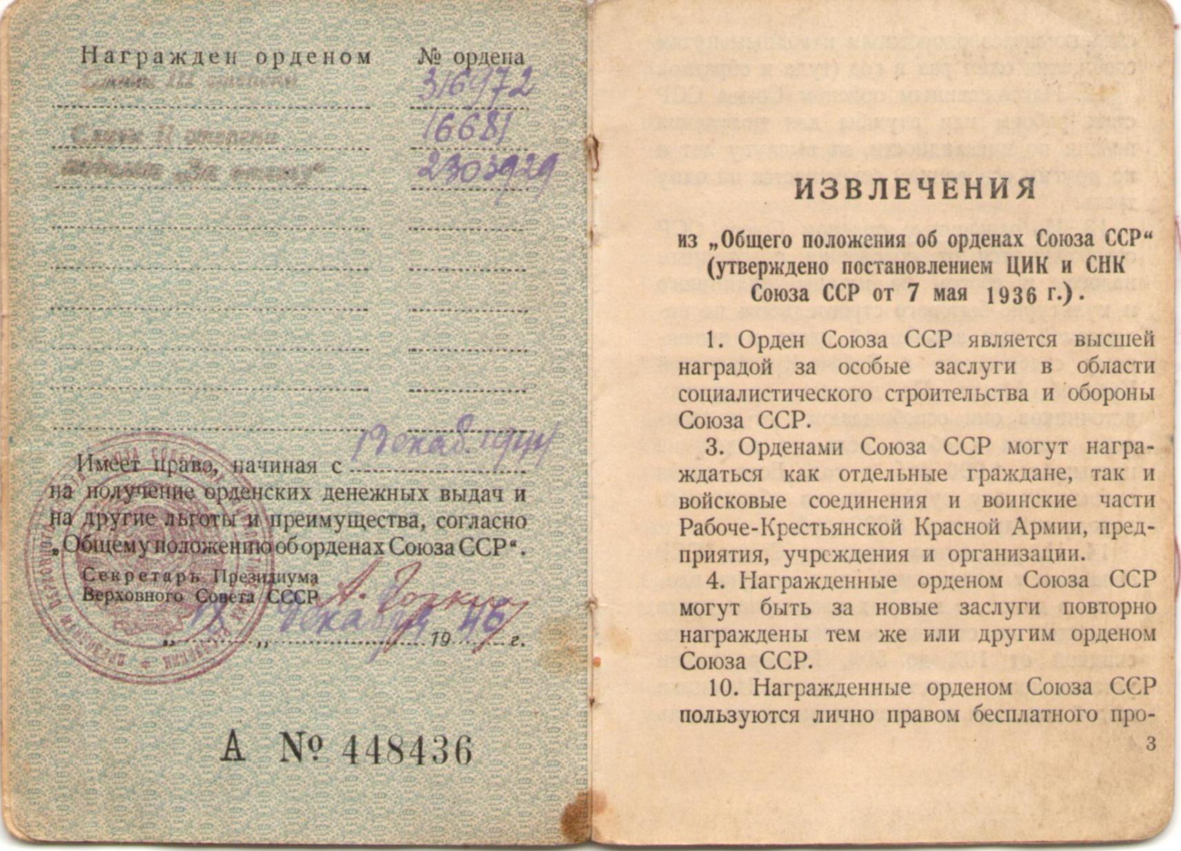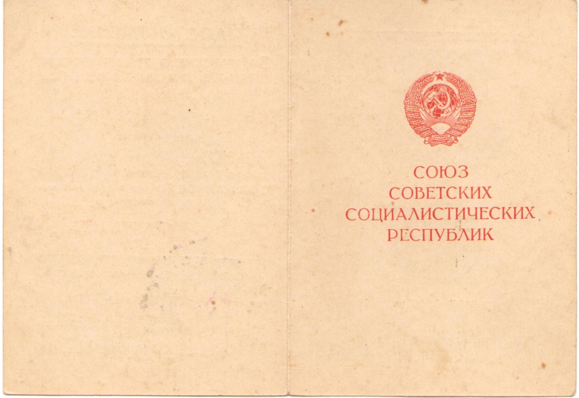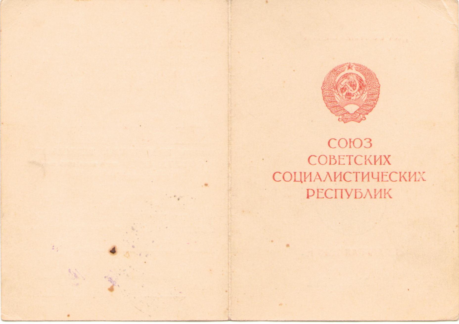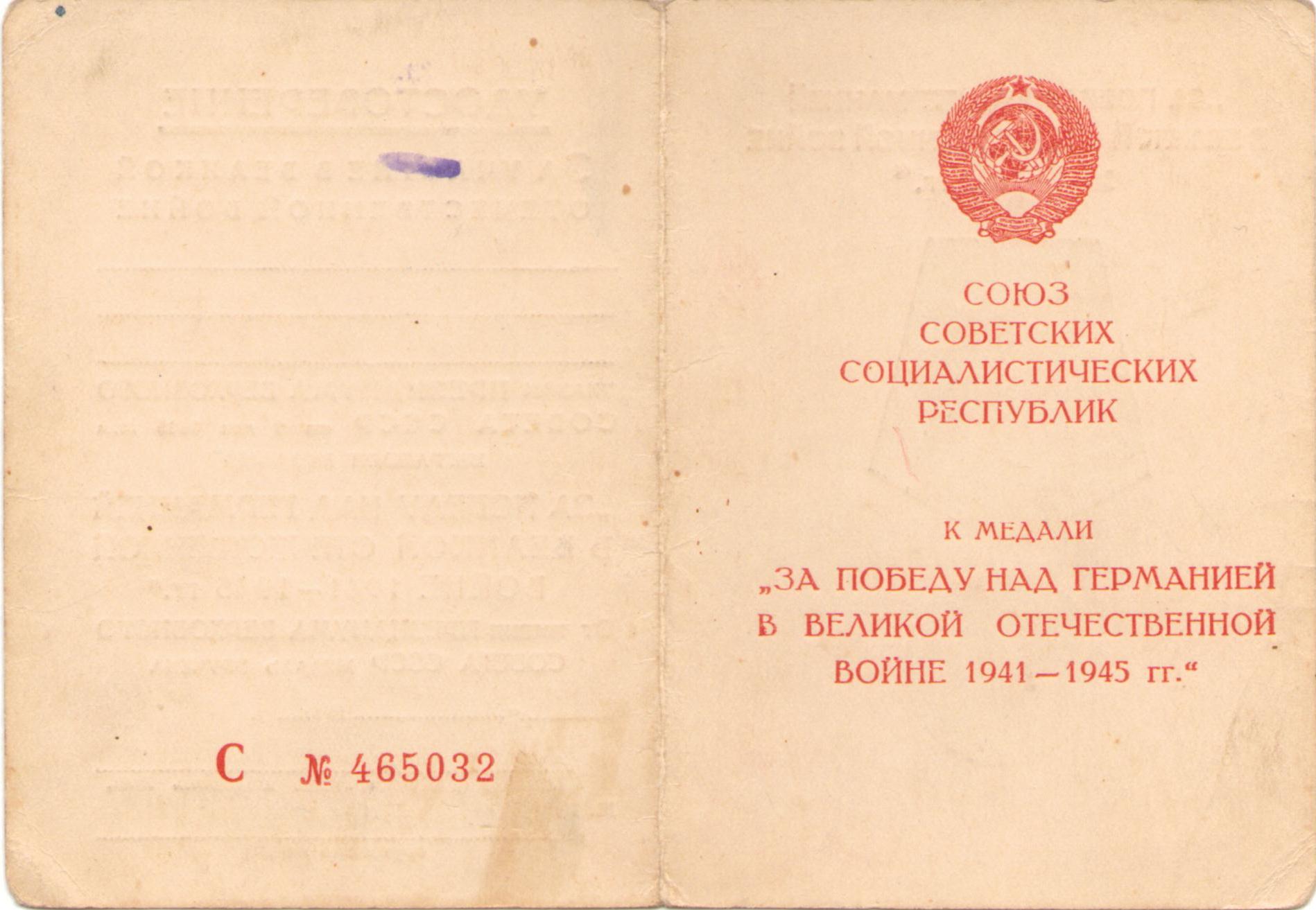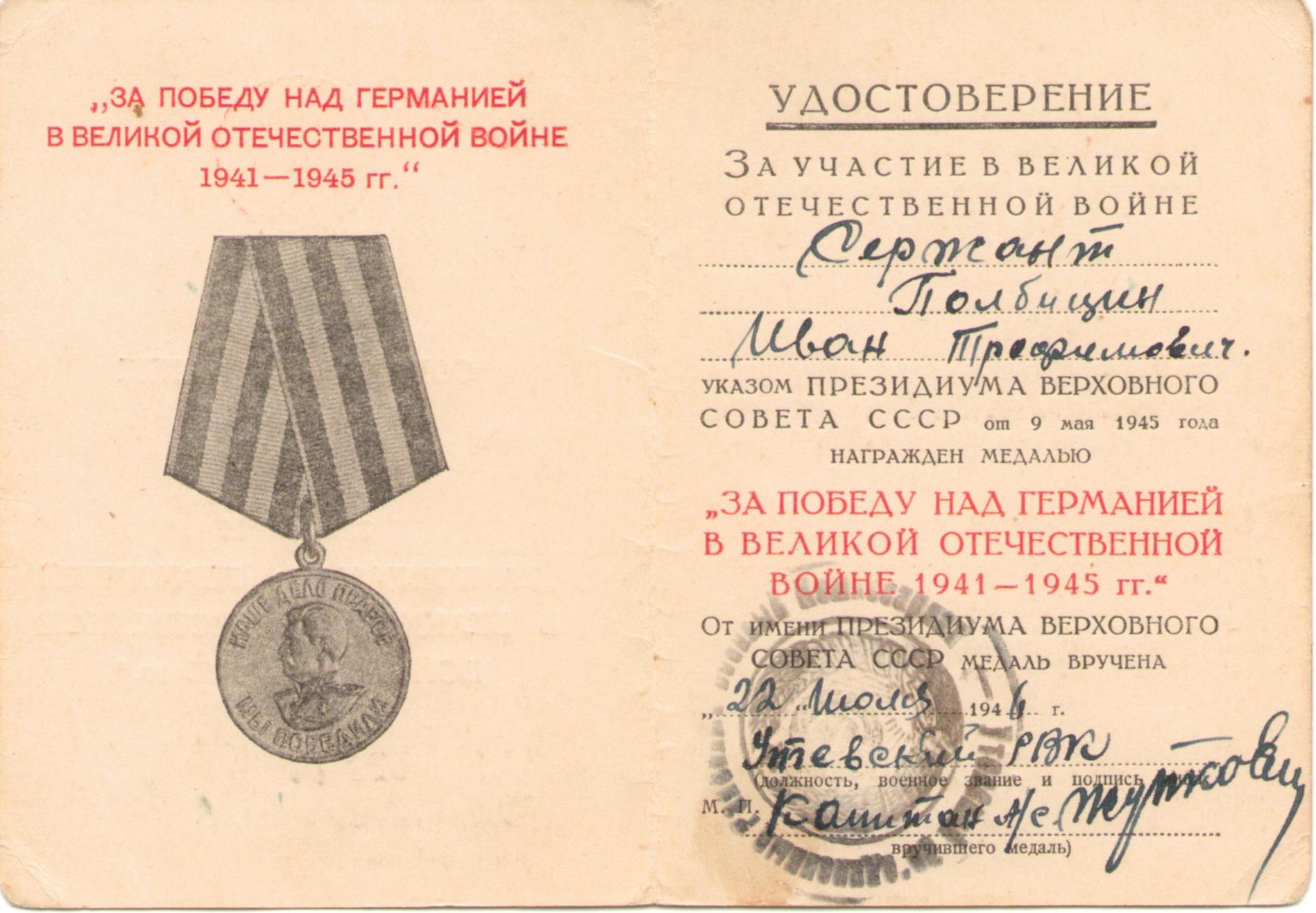 Полбицын И.Т. Удостоверение к медали «За победу над Германией в Великой Отечественной войне 1941-1945 гг.», медаль вручена 22 июля 1946 г. (2 стр.)