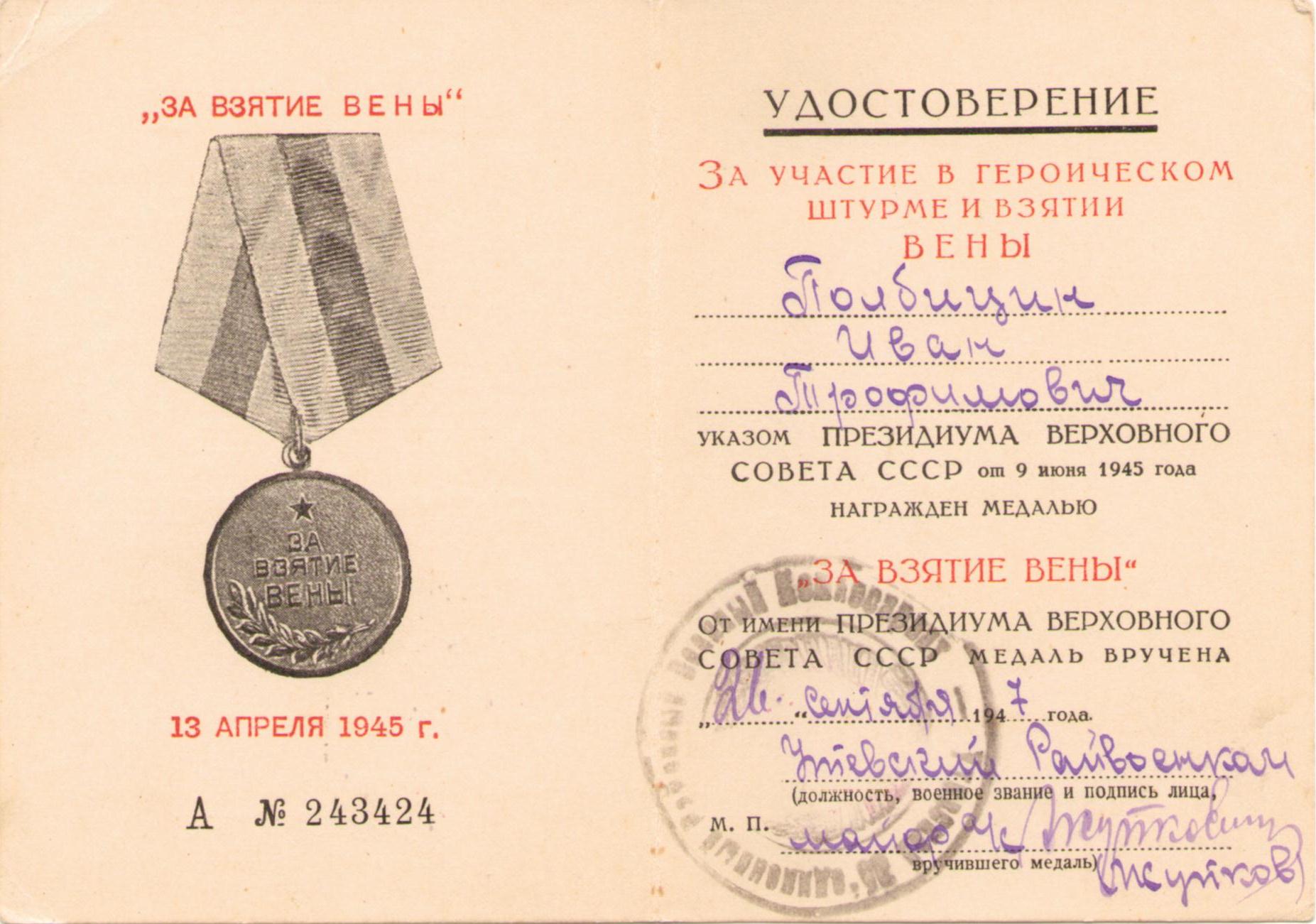 Полбицын И.Т. Удостоверение к медали «За взятие Вены», медаль вручена 26 сентября 1947 г. (2 стр.)