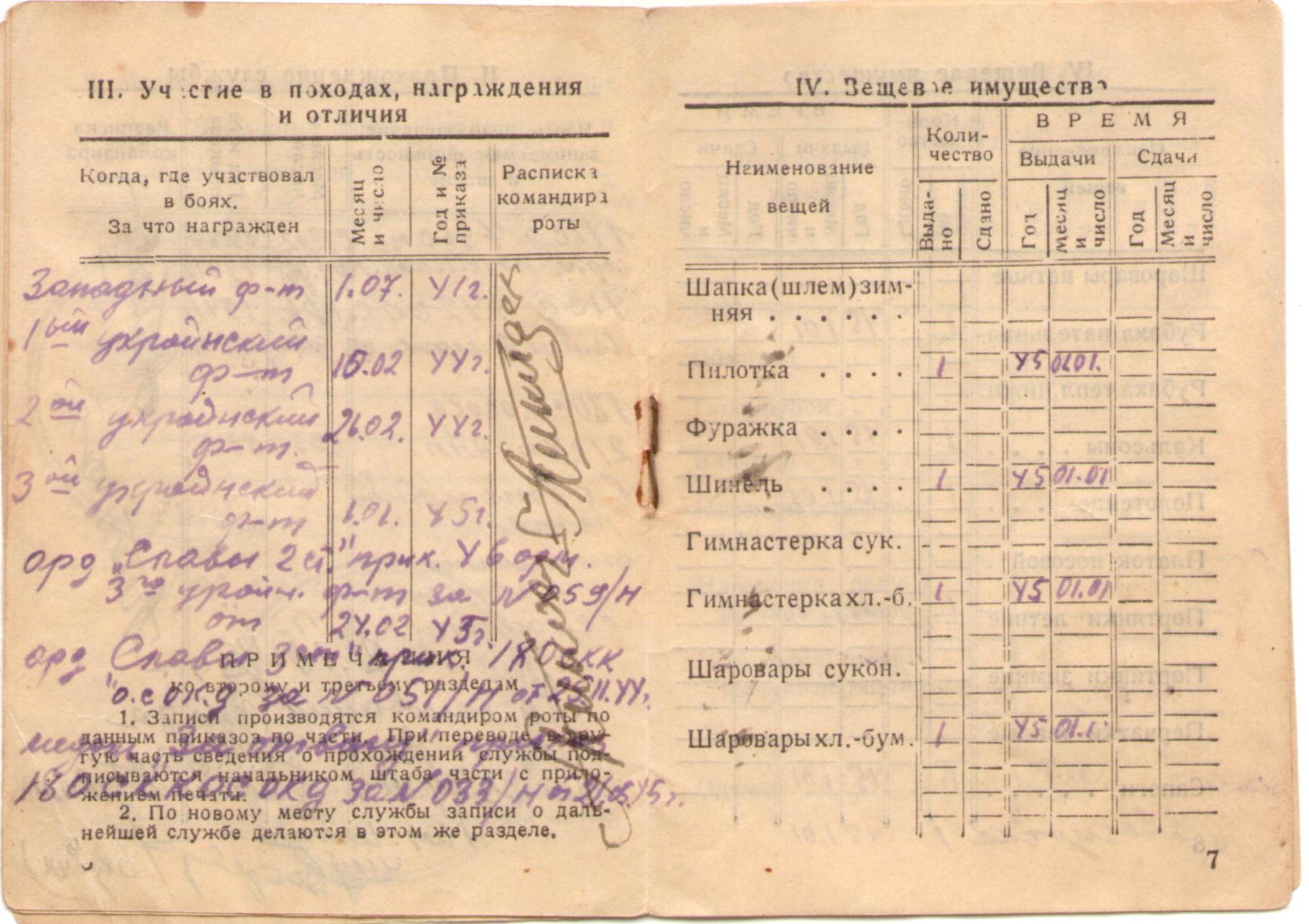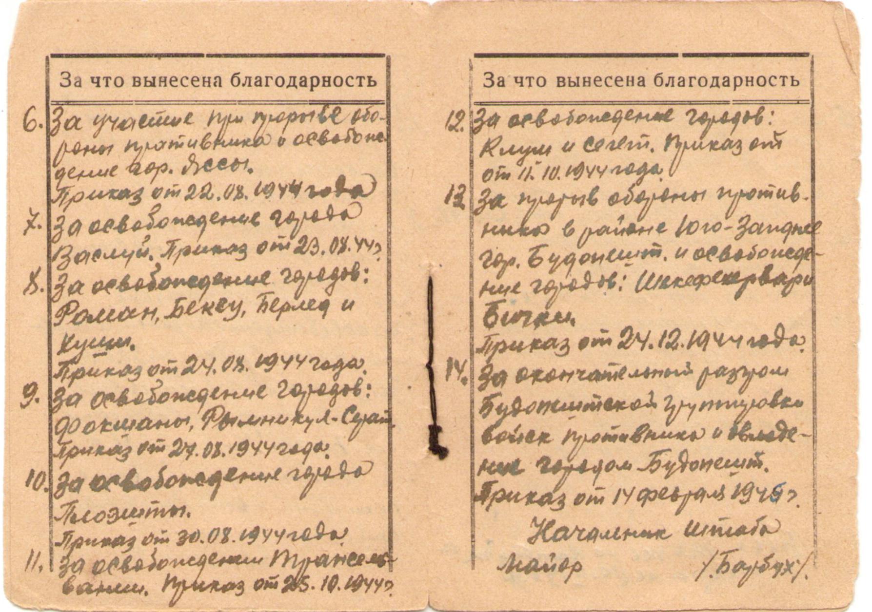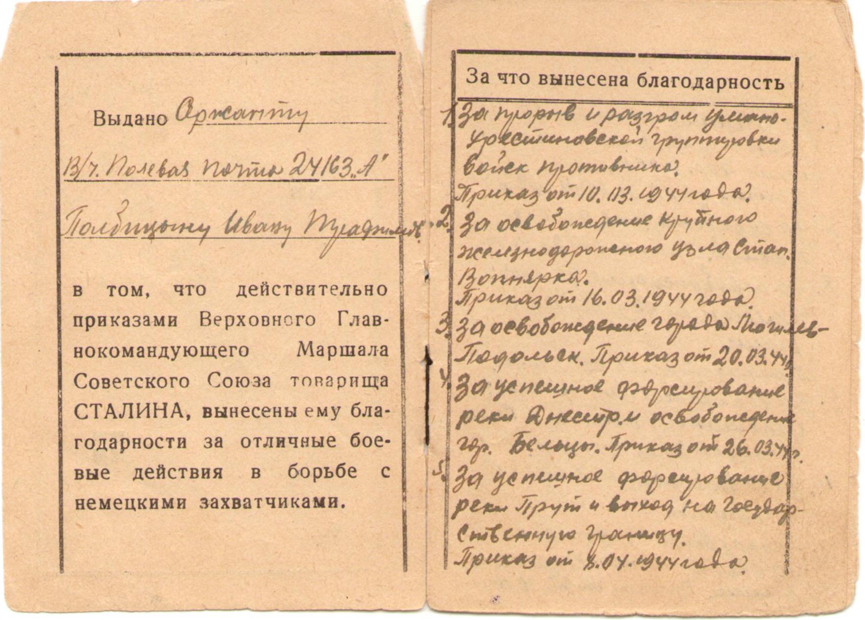 Удостоверение с перечнем благодарностей, вынесенных Полбицыну Ивану Трофимовичу за отличные боевые действия в борьбе с немецкими захватчиками (4 стр.)