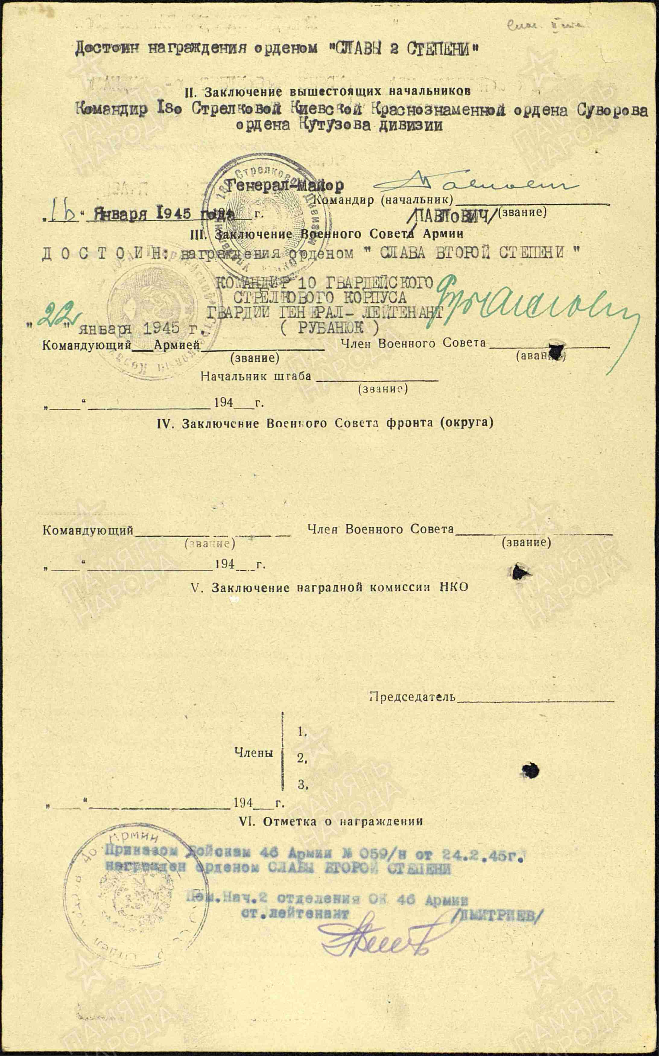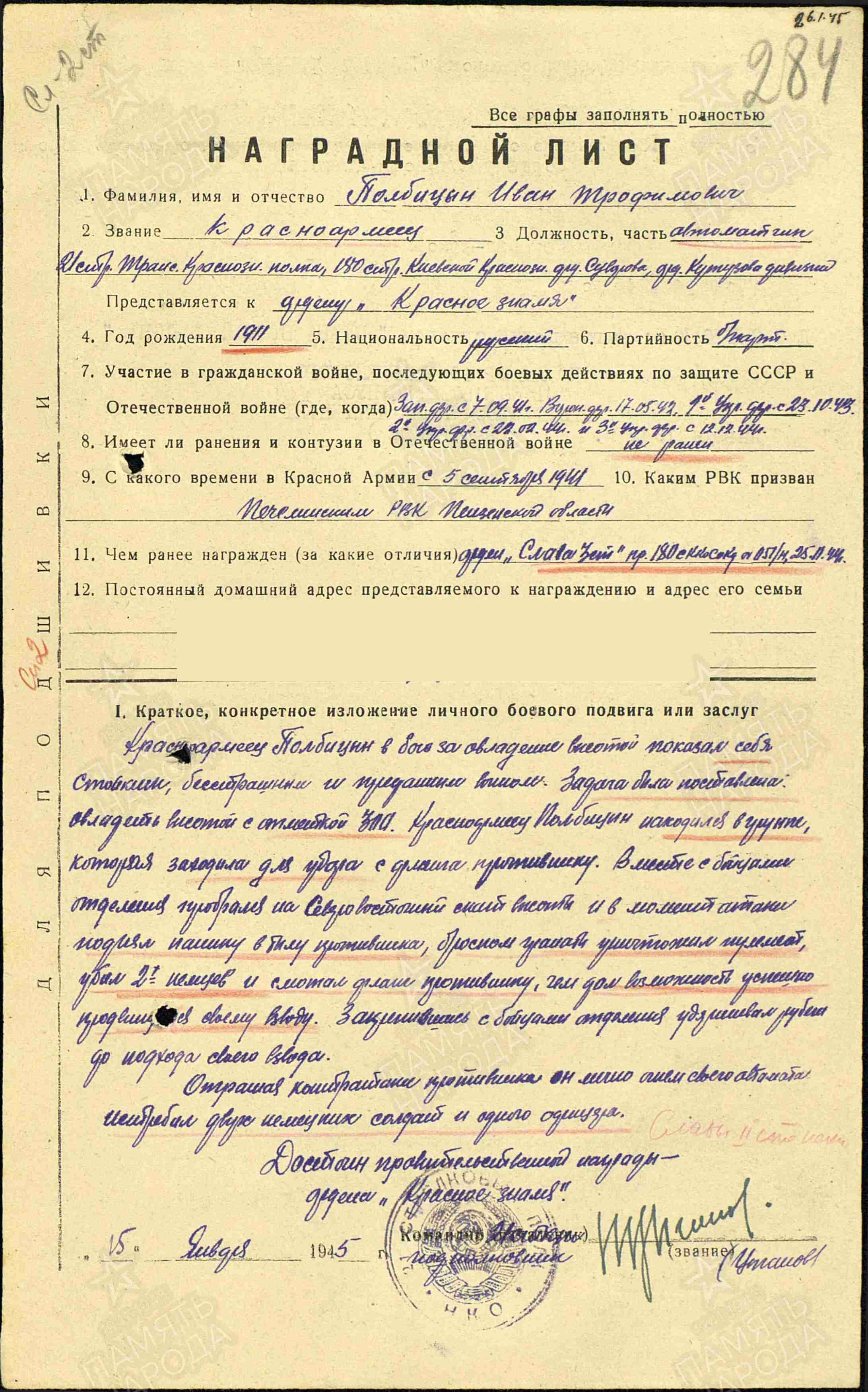 Полбицын И.Т. Наградной лист от 15.01.1945 г. к ордену Красного Знамени (решением командования был награжден орденом Славы II степени), архивная копия, 2 стр.