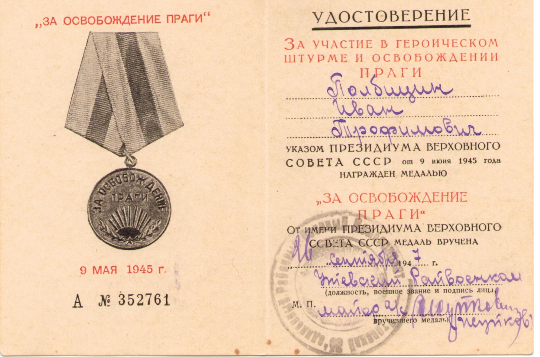 Полбицын И.Т. Удостоверение к медали «За освобождение Праги», медаль вручена 26 сентября 1947 г. (2 стр.)