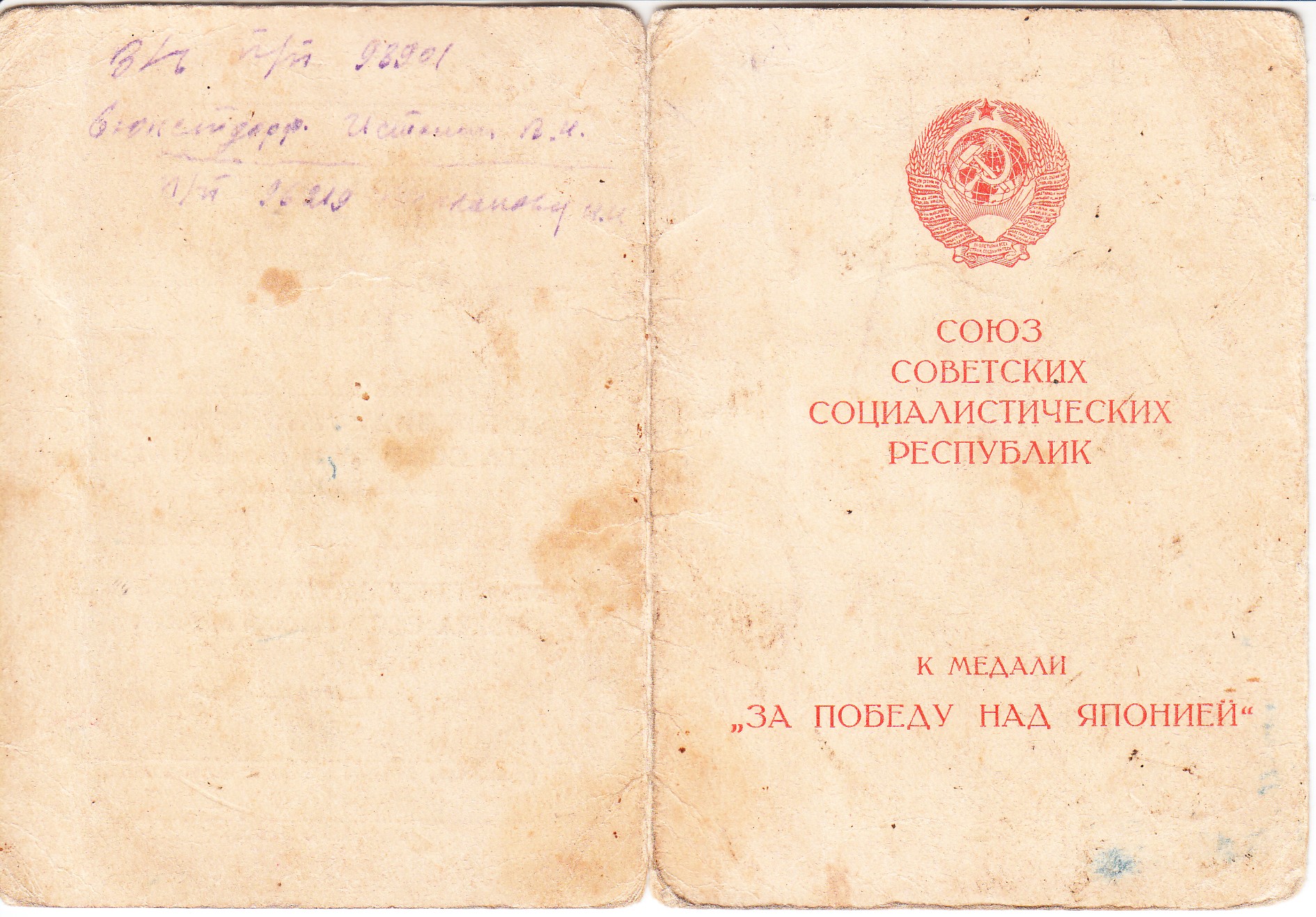 Награды: орден Красной Звезды, орден Красного Знамени, медаль «За отвагу» (дважды), медаль «За боевые заслуги», медаль «За победу над Японией».