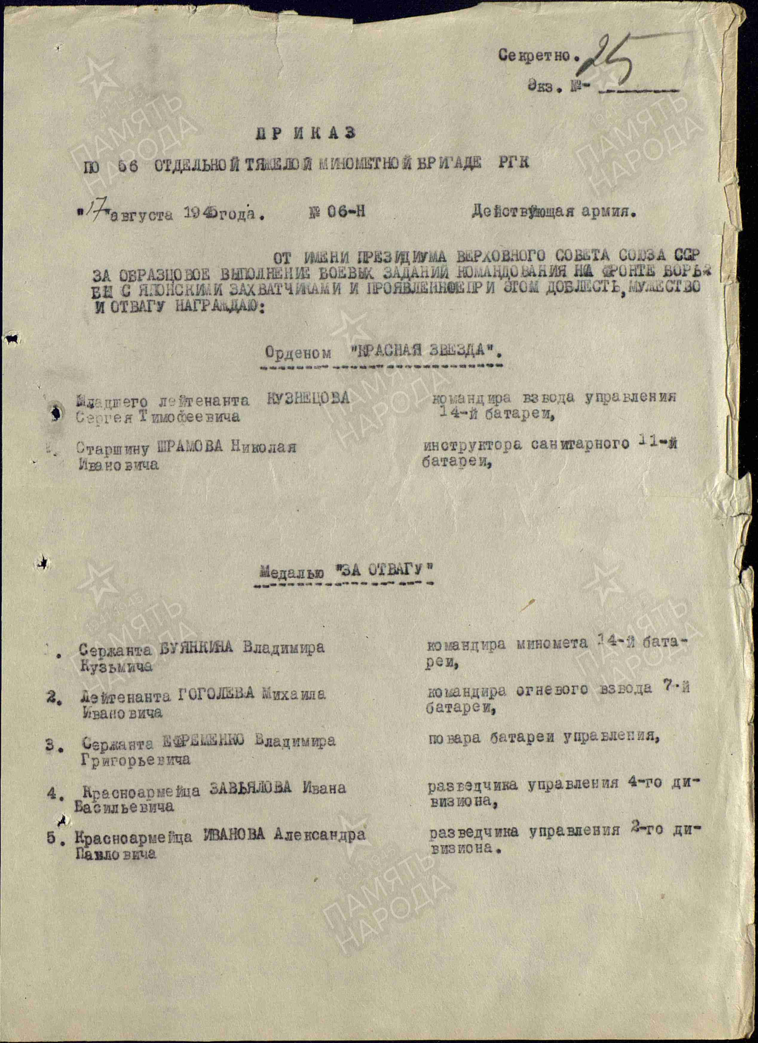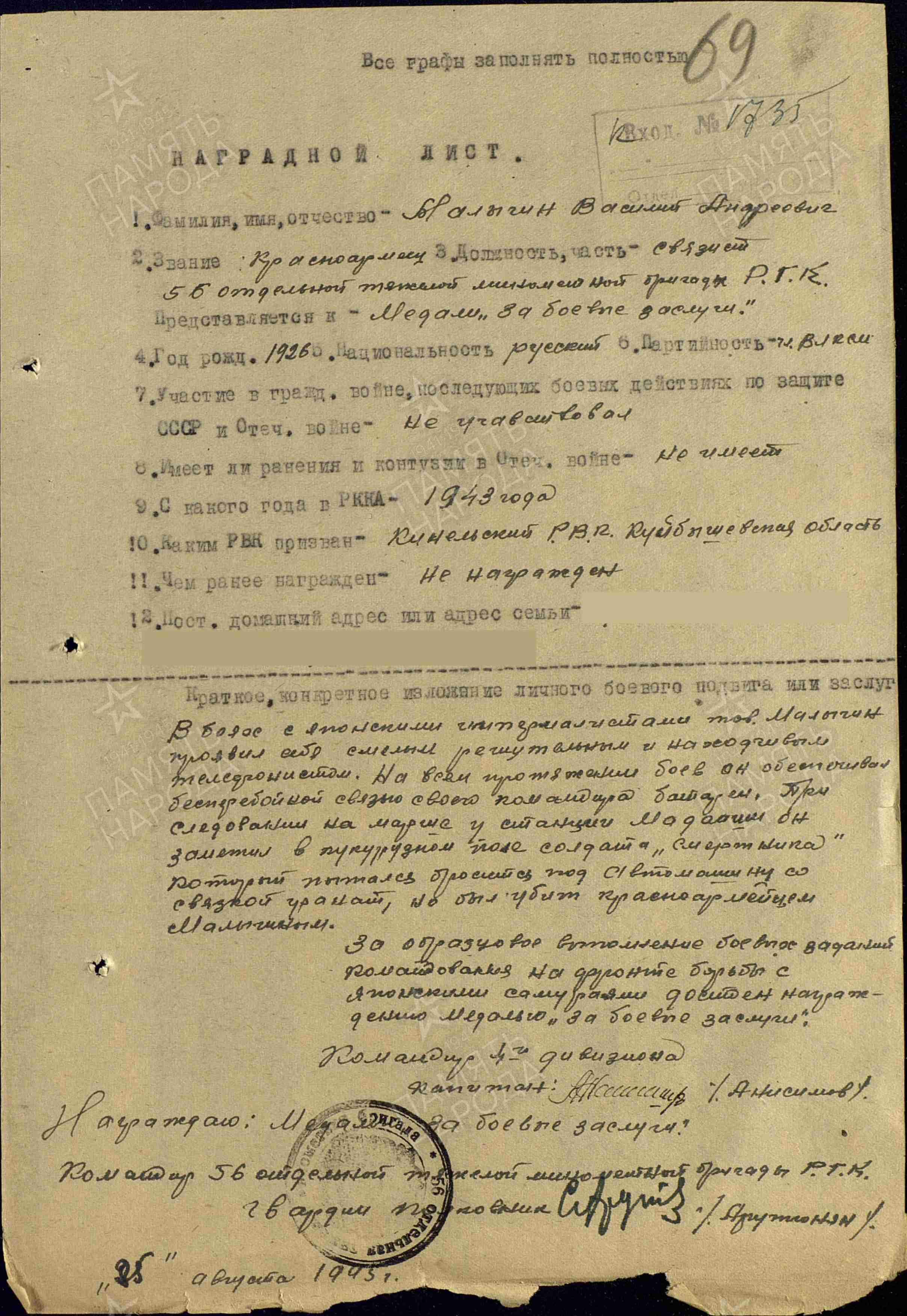 Информация из Наградного листа от 5 августа 1945 г.: "В боях с японскими милитаристами тов. Малыгин проявил себя смелым, решительным и находчивым телефонистом. На всем протяжении боев он обеспечивал бесперебойной связью своего командира батареи. При следовании на марше при станции Мадаоши он заметил в кукурузном поле солдата «смертника», который пытался броситься под машину со связкой гранат, но был убит красноармейцем Малыгиным. За образцовое выполнение боевых заданий командования на фронте борьбы с японскими самураями достоин награждения медалью «За боевые заслуги».