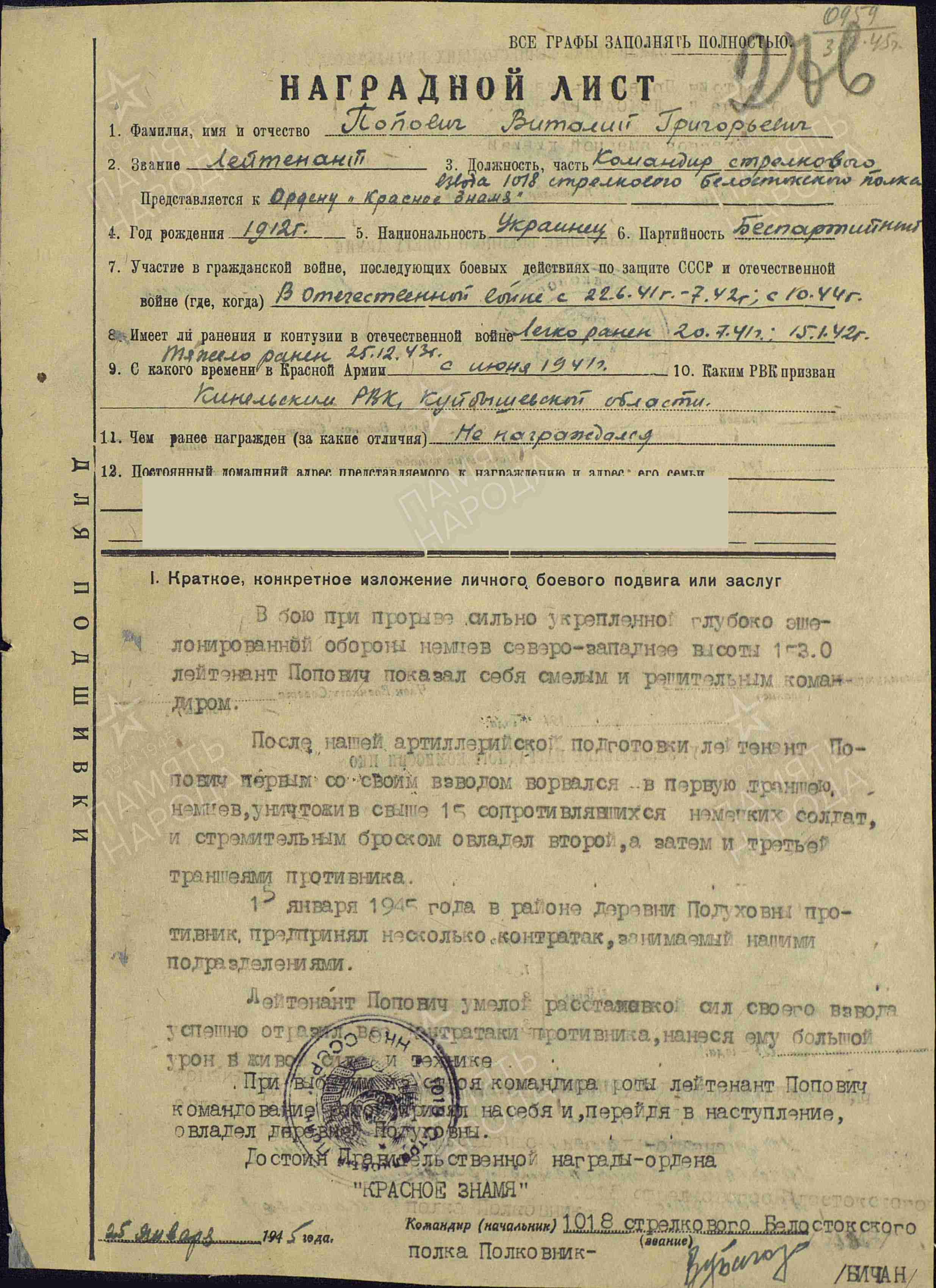 Информация из наградного листа от 25 января 1945 года: «В бою при прорыве сильно укрепленной глубоко эшелонированной обороны немцев северо-западнее высоты 1-30 лейтенант Попович В.Г., показал себя смелым и решительным командиром. После артиллерийской подготовки лейтенант Попович первым со своим взводом ворвался в первую траншею немцев, уничтожив 15 сопротивлявшихся немецких солдат и стремительным броском овладел второй, а затем и третьей траншеями противника. 15 января 1945 года в районе деревни Подуховны противник предпринял несколько контратак, занимаемый нашими подразделениями. Лейтенант Попович Виталий Григорьевич в умелой расстановки сил своего взвода успешно отразил все контратаки противника, нанеся ему большой урон в живой силе и технике. При выбытие из строя командир роты лейтенант Попович В.Г. командовавший ротой принял на себя и перейдя в наступление овладел деревней «Подуховны». Достоин правительственной награды Ордена «Красного Знамени». Приказом от 5 февраля 1945 года №575 от имени Президиума Верховного Совета Союза ССР, за образцовое выполнение боевых заданий командования на фронте борьбы с немецкими захватчиками и проявленные при этом доблесть и мужество командир взвода 1018 стрелкового Белостокского полка 269 стрелковой Рогочевской Краснознаменной дивизии – Попович Виталий Григорьевич награжден Орденом Красного Знамени.