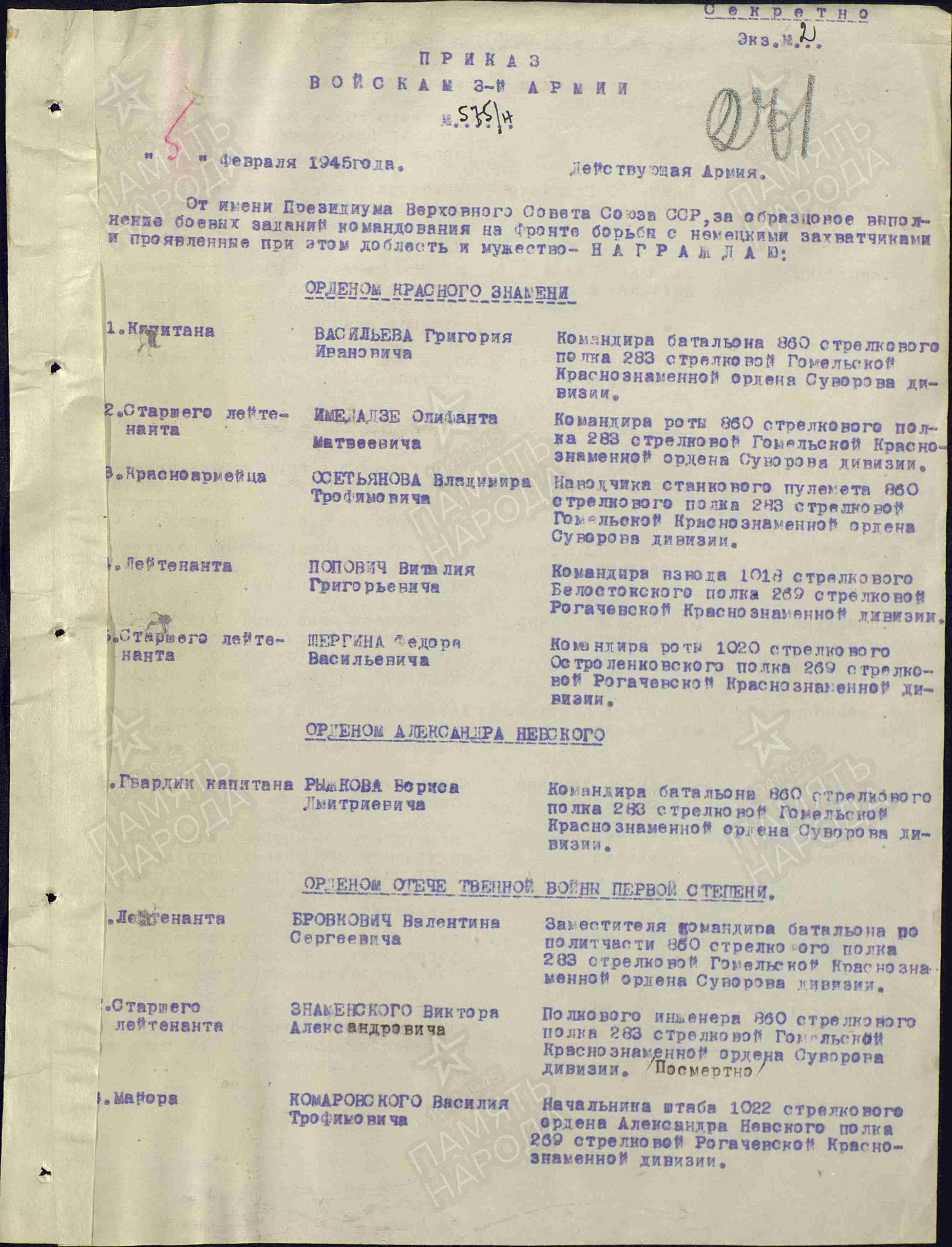 В апреле 1946 года приказом Главного управления кадров министерства вооруженных сил СССР народного комиссариата обороны СССР по личному составу армии отменяется 114 статей приказом ГУК НКО и ГУФКА об исключении из списков Красной армии офицерского состава, как погибшего и пропавшего без вести в боях против немецко-фашистских войск, но в последствие оказавшихся в живых среди освободившихся из фашистского плена, в их числе, освобожденный из плена Попович В.Г.