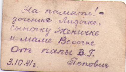 Виталий Попович родился в 1912 году. В рядах Рабоче-Крестьянской Красной Армии находился с июня 1941 года, место призыва: Кинельский РВК Куйбышевской области. Должность – командир взвода 1018 стрелкового Белостокского полка. Звание - лейтенант. 12 ноября 1942 года из списков Красной Армии были исключены 209 человек начальствующего состава, пропавшего без вести в боях против немецко-фашистских войск. Среди них Заместитель командира роты 2-ой Гвардейской стрелковой дивизии Попович Виталий Григорьевич пропал без вести 20 июля 1942 года.