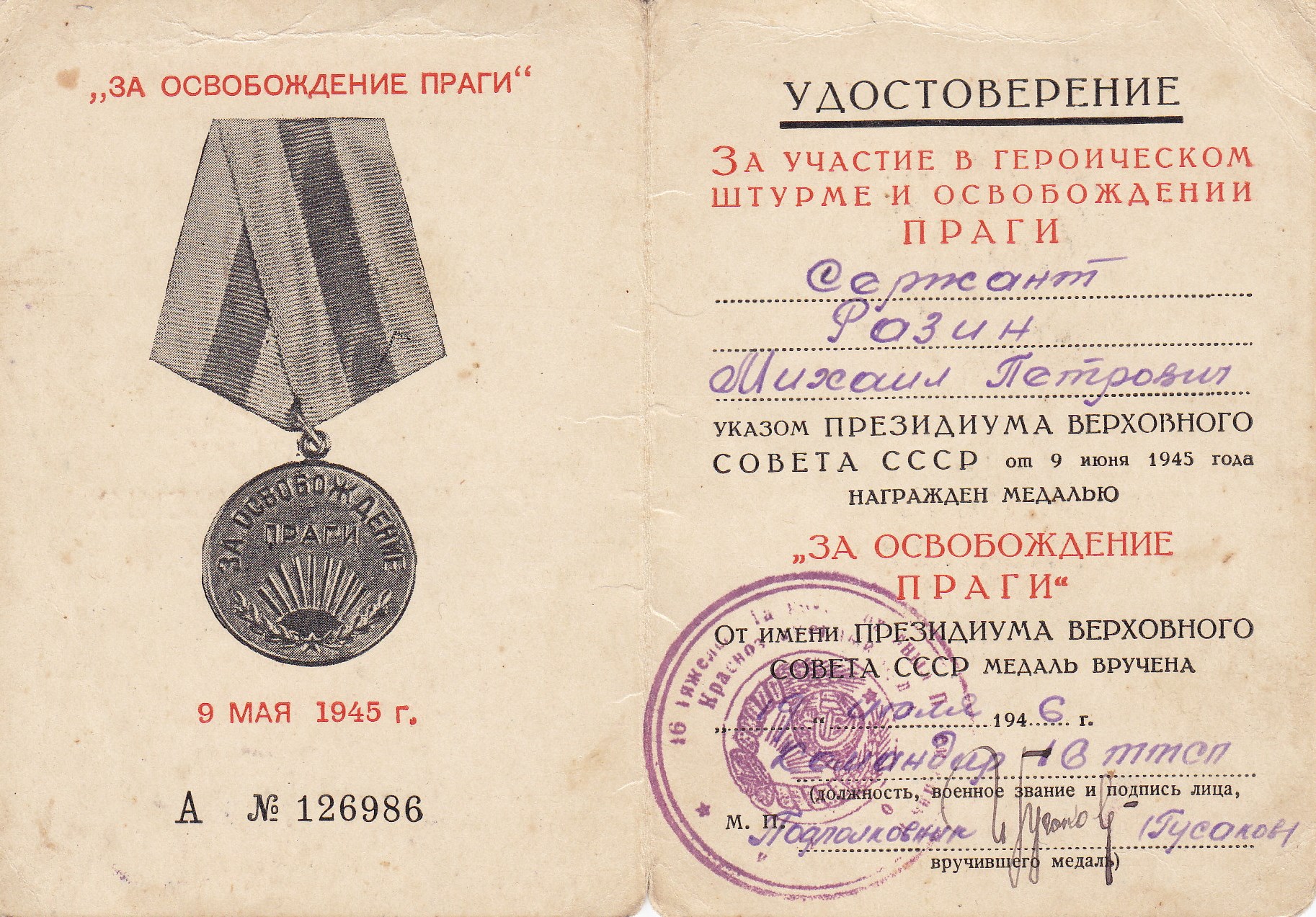 Разин М.П. Удостоверение к медали «За освобождение Праги», медаль вручена 19 июля 1946 г. (2 стр.)