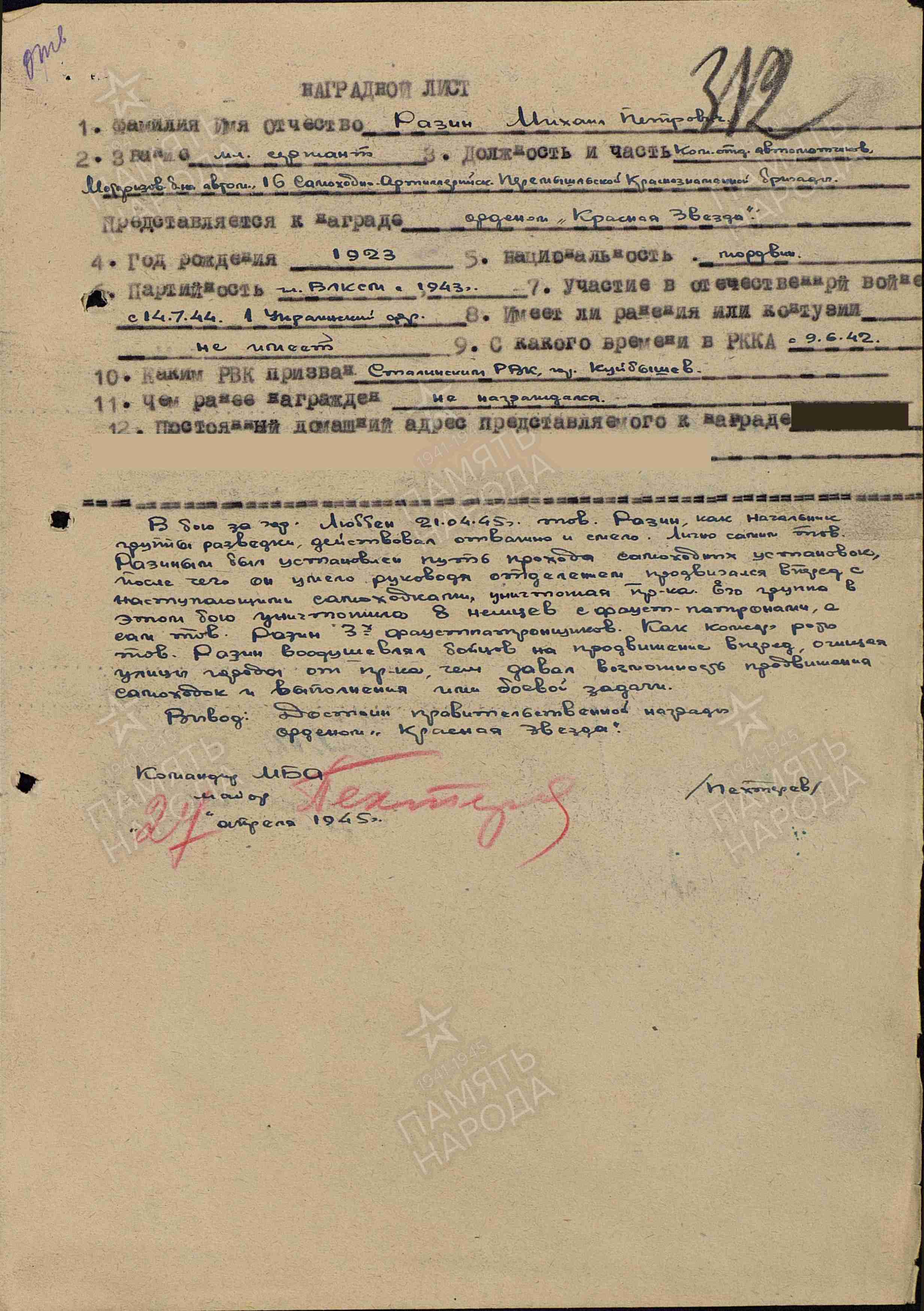 Разин М.П. Наградной лист от 27 апреля 1945 г. к ордену Слава III степени (архивная копия)