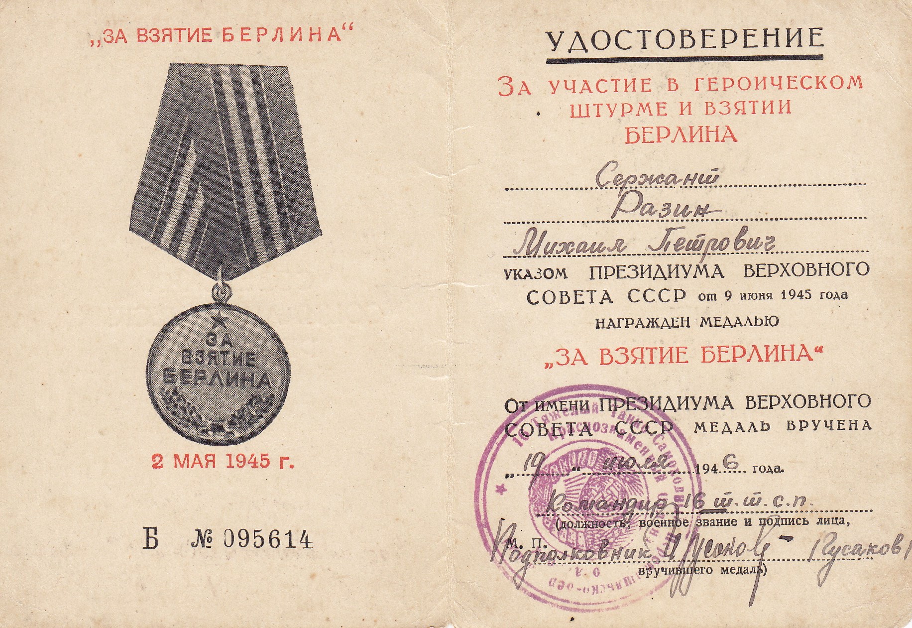 Разин М.П. Удостоверение к медали «За взятие Берлина», медаль вручена 19 июля 1946 г. (2 стр.)