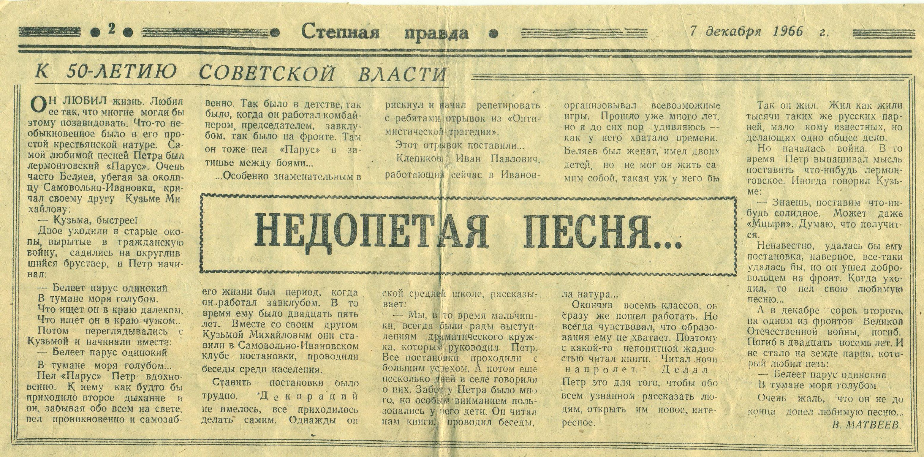 Информация записана со слов сына, Владимира Петровича Беляева: «Петр Беляев родился 10 июля 1913 года в селе Самовольно-Ивановка Алексеевского района Куйбышевской области. Работал механизатором, заведующим клубом. Был женат, имел двоих детей. Коммунист. В 1942 г. добровольцем ушел на фронт. Сначала работал на заводе в городе Чапаевск, затем в составе действующей армии отправлен на фронт. В письме к жене он сообщал, что 21 июня 1942 г. выбыл из города Урюпинск, далее шли на юг пешком. В июле 1942 г. остановились в Ростовской области, в хуторе Дубровский Ростовской области. Воевал на Сталинградском фронте в 153 стрелковой дивизии 566 стрелкового полка в Ростовской области, на берегу реки Дон. Погиб в звании рядового 20 декабря 1942 года. Похоронен в хуторе Мещеряковский Верхнедонского района Ростовской области».
