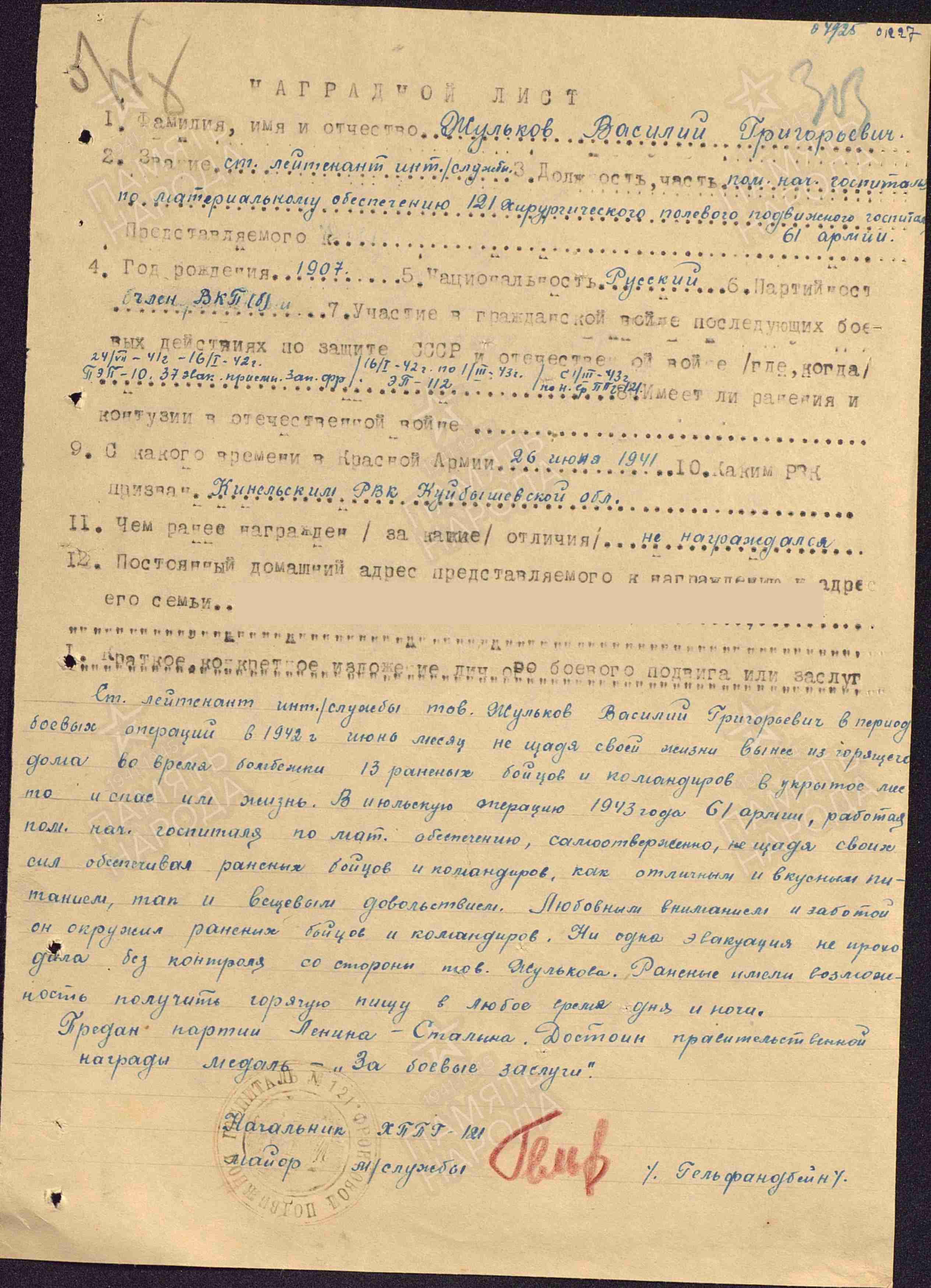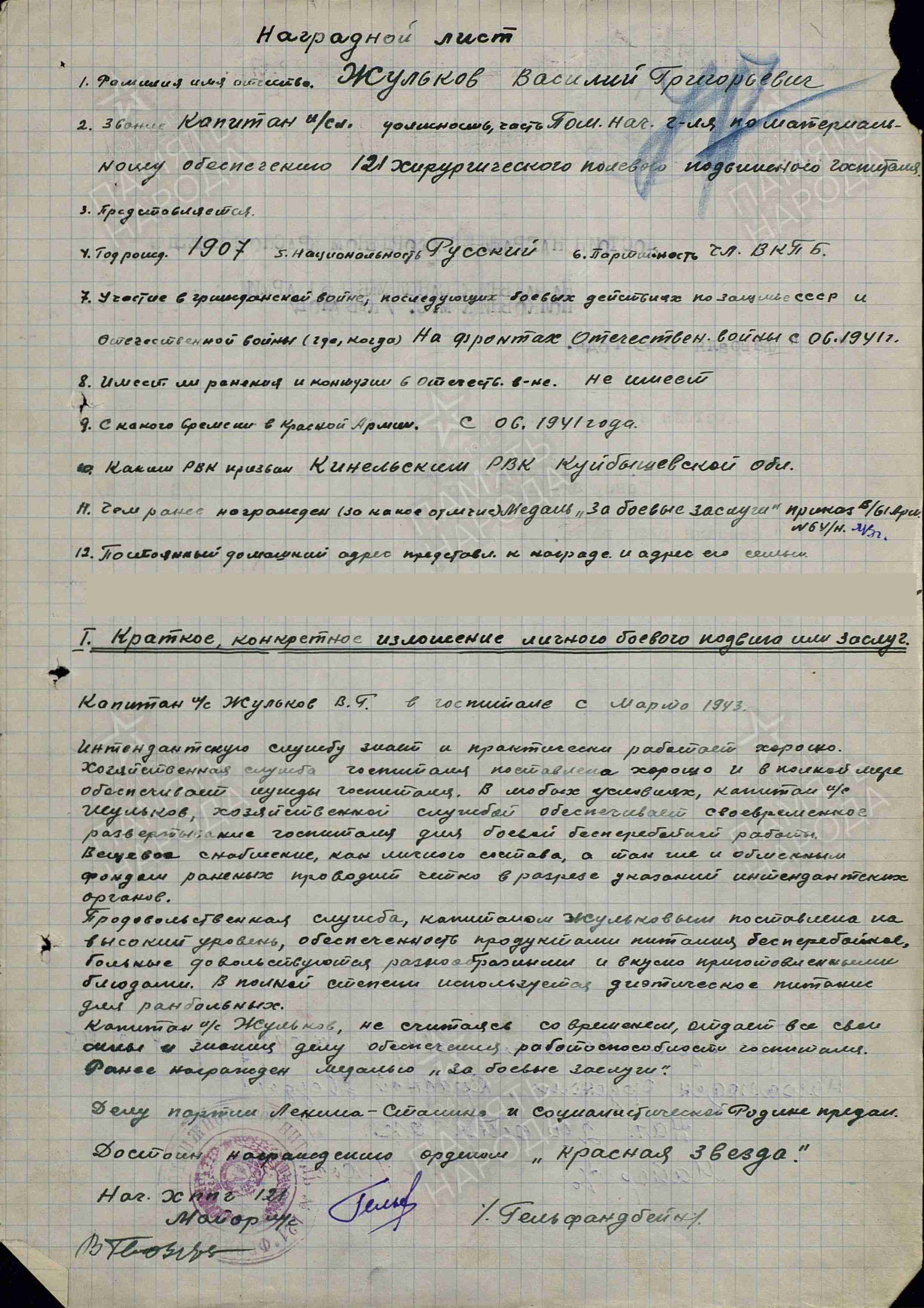 Василий Григорьевич родился в с. Бобровка Кинельского района в 1907 году. Воинское звание: старший лейтенант интендантской службы. Дата окончания службы: 15.05.1946 г. Дошёл до Берлина. Василий Григорьевич Жульков умер 7 апреля 1975 года, похоронен с родном селе.