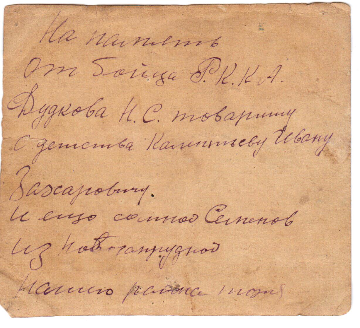 Николай Дудков родился в 1919 году в селе Георгиевка Кинельского района. Ушел на фронт в 1941 году. Погиб. На единственной сохранившейся фотографии 1941 года Николай Дудков запечатлен со своим другом Семеновым (на обороте фотографии есть об этом надпись).