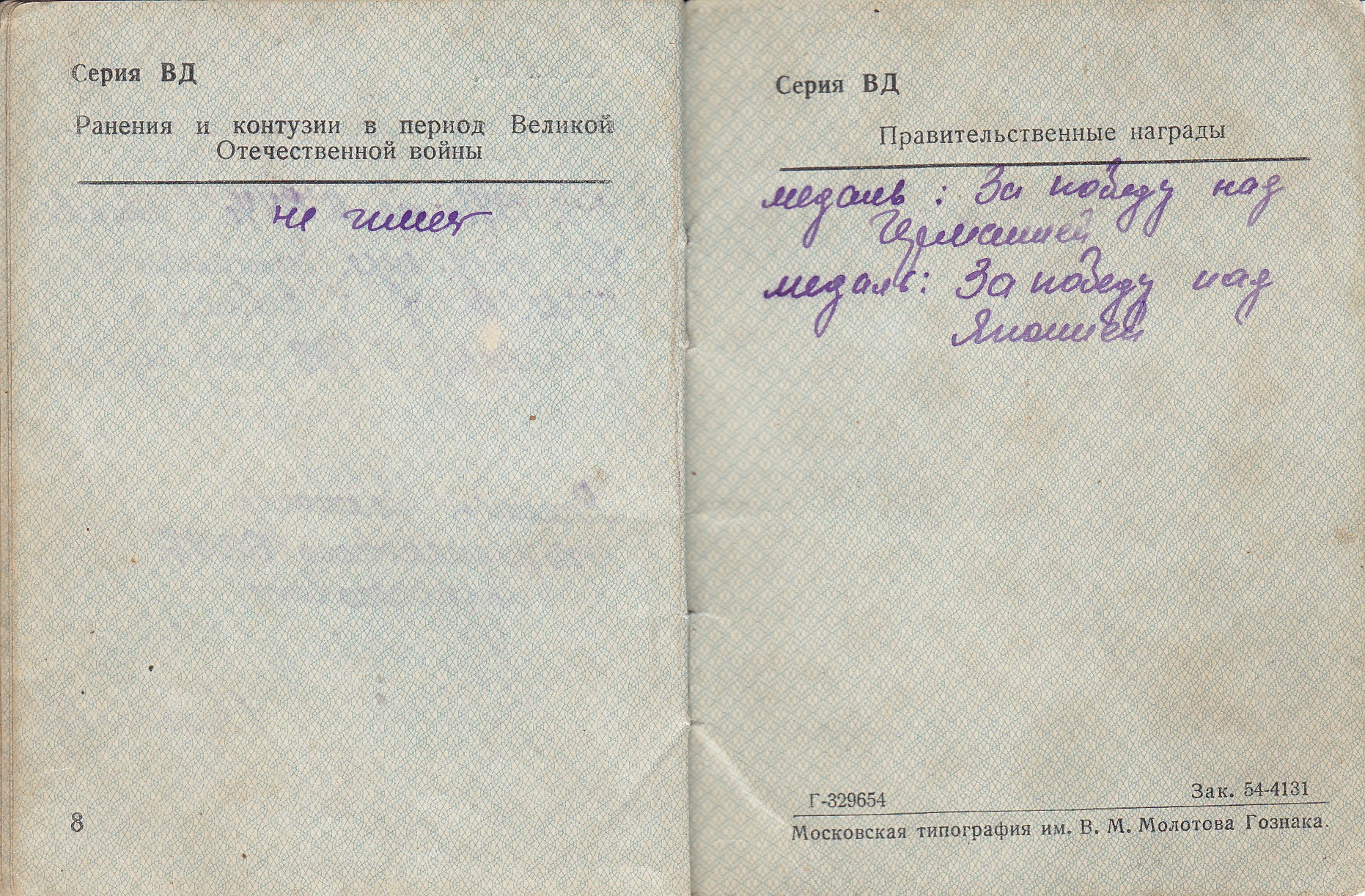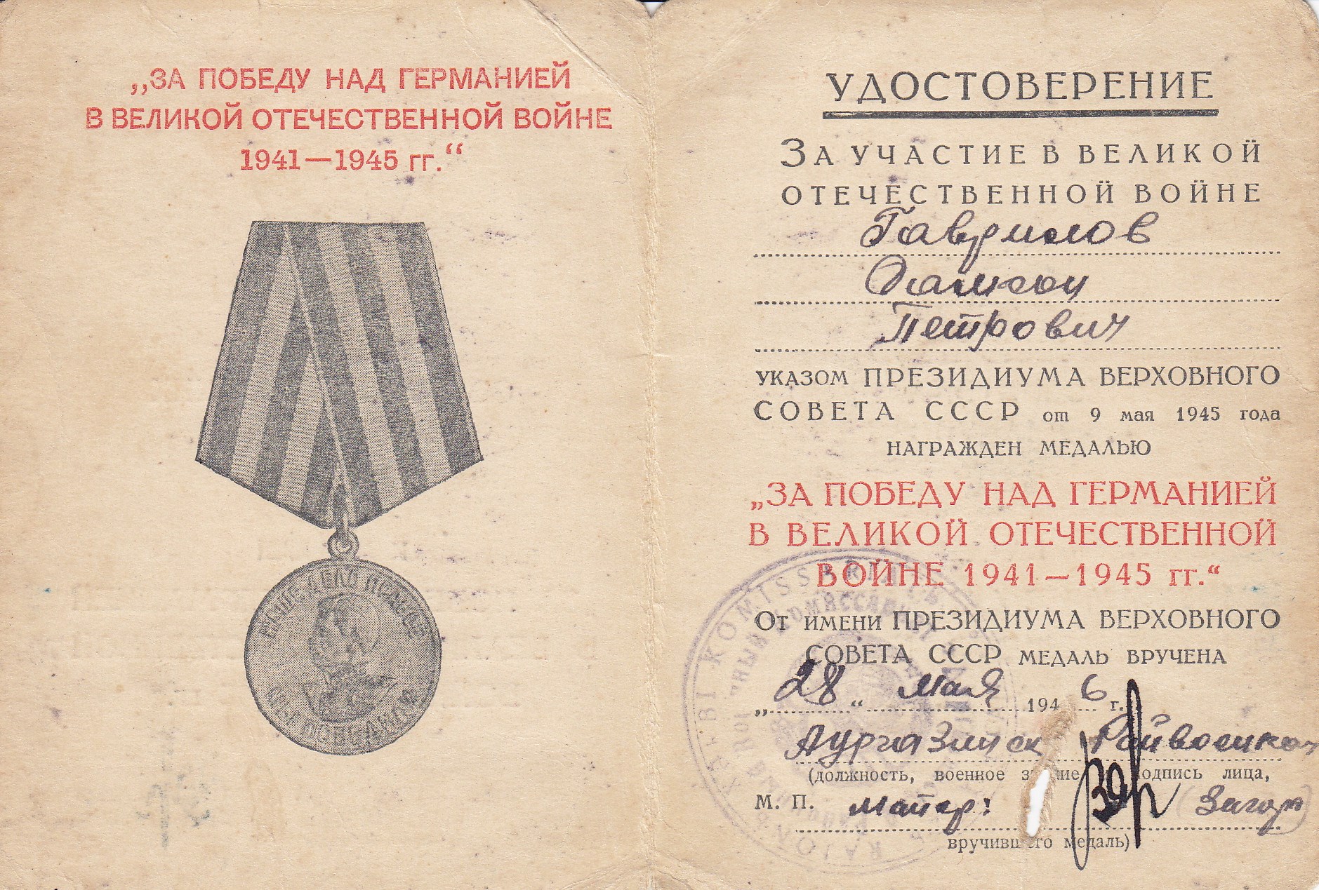 Гаврилов С.П. Удостоверение к медали «За победу над Германией в Великой Отечественной войне 1941-1945 гг.», медаль вручена 28 мая 1946 года (2 стр.)