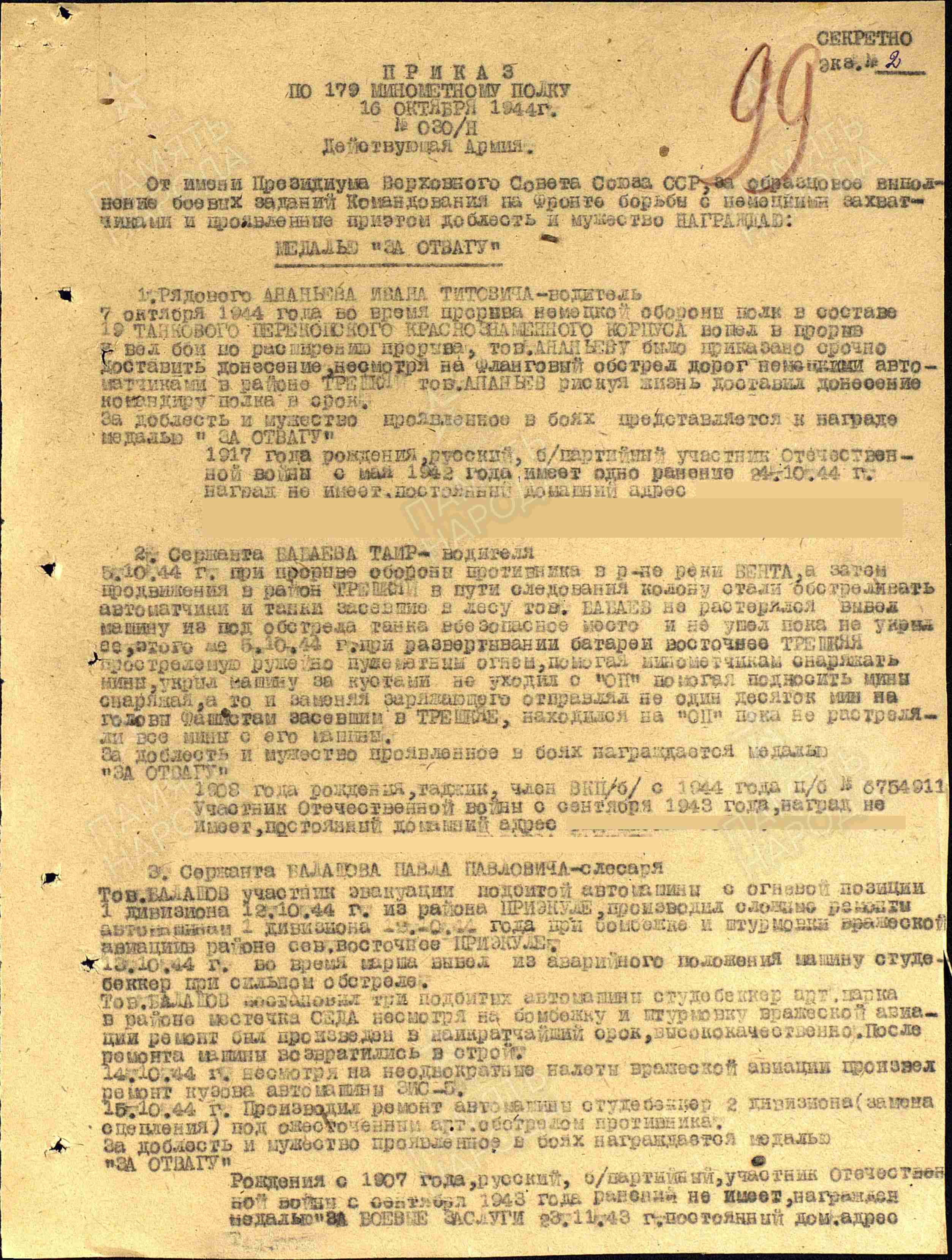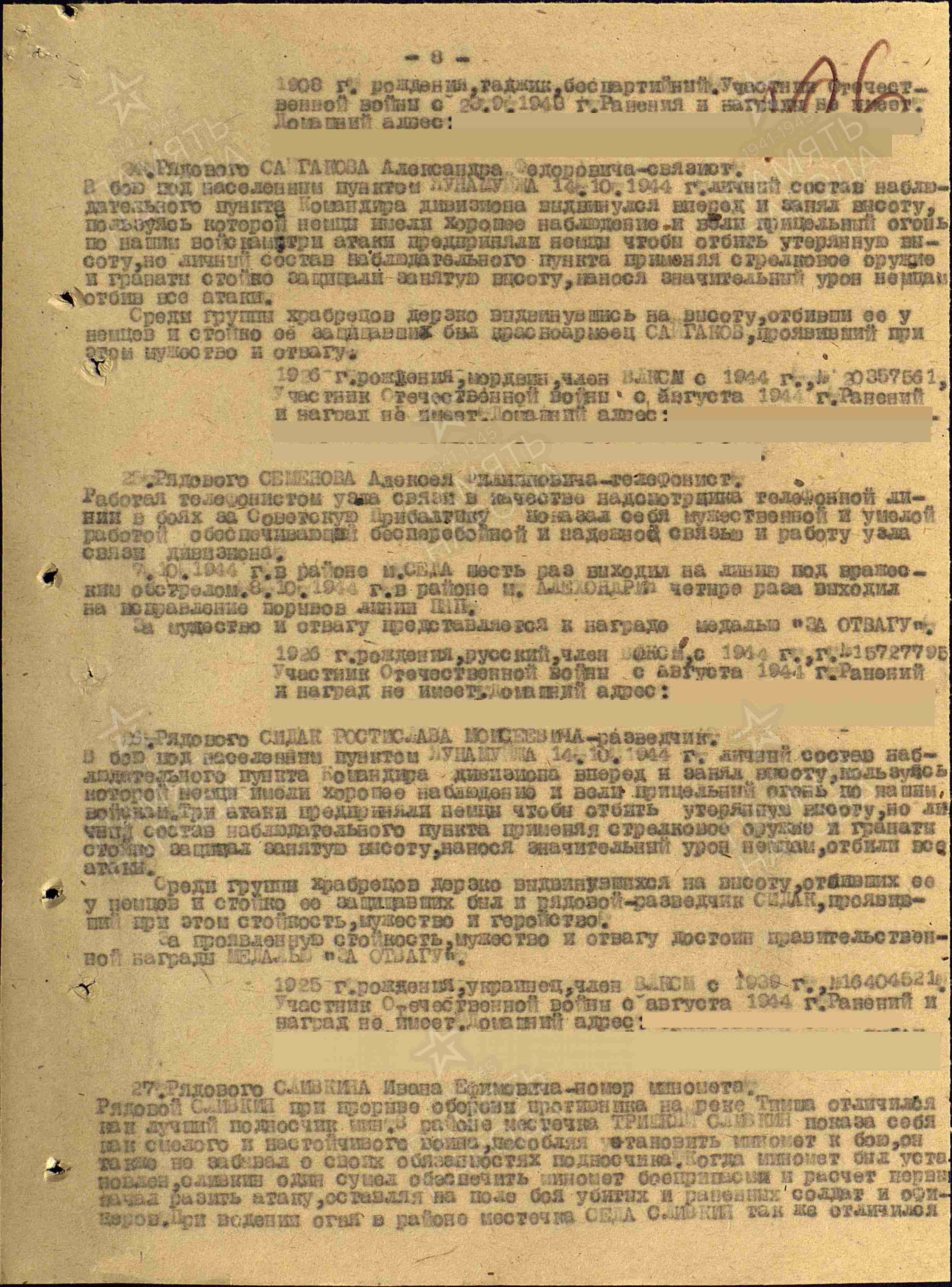 Иван Сливкин 1926 года рождения. В армию призвали в ноябре 1943 г., служил артиллеристом в 162-ом миномётном полку 1 Прибалтийского фронта. 31 декабря принимал участие в крупном сражении. Был ранен, пролежал в госпитале два месяца. Затем был направлен в Румынию, а осенью 1944 года в Чехословакию. Потом был направлен в учебный батальон, где получил звание сержанта. Как отличник учебы был оставлен при училище учить новобранцев на курсах молодого бойца. Домой вернулся в звании старшины в 1951 году (информации больше нет).