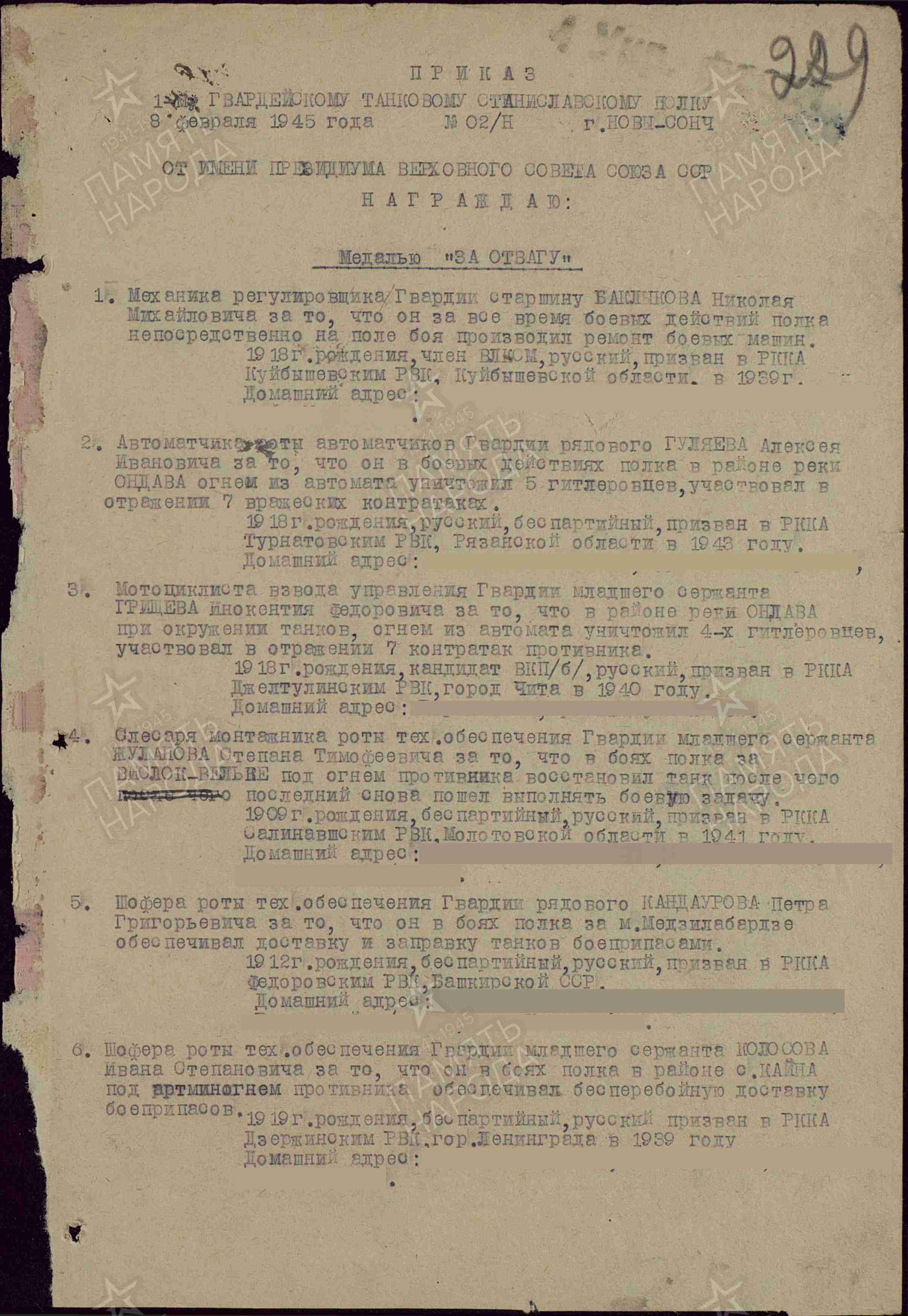 Родился в 1918 году. В действующую армию был призван в 1935 г., служил танкистом на Т-26. Старшина. Начал войну на Ленинградском фронте в октябре 1941 г. На 7-й день получил ранение и после госпиталя был направлен на Волховский фронт. Освобождал Большую и Малую Вишеру. В Горьком получил новый танк Т-34. Воевал и на Западном фронте. На тяжелом КВС-1 Дошел до Днепра. В Туле получил танк ИС. Закончил войну в Праге. После войны работал в совхозе «Кутулукский». Умер в 1998 году. Похоронен в с. Большая Малышевка.