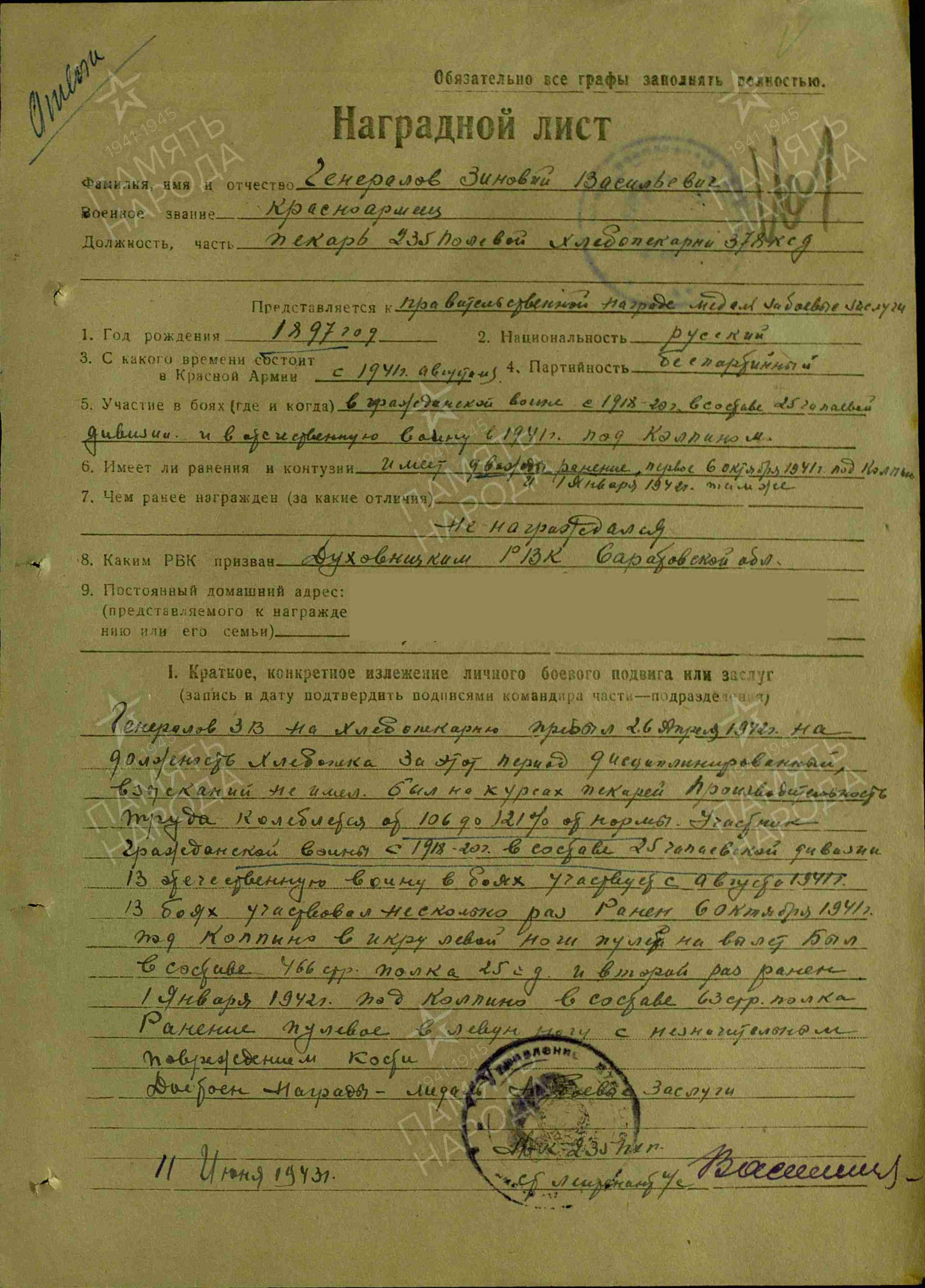 Родился в 1897 году в селе Озерки Духовицкого района Саратовской области. Участник Гражданской войны (с 1919 по 1922 гг.) В августе 1941 года призван в ряды РККА. Служил в 466 стрелковом полку. Был дважды ранен. Первое ранение получил в октябре 1941 года под Колпино, второе ранение получил 1 января 1942 г. в левую ногу с незначительным повреждением кости. С 26 апреля 1942 года служил в должности хлебопека. Производительность труда составляла 106-120% от нормы. Зиновий Васильевич был демобилизован в 1945 году, вернулся в родное село, работал в колхозе.