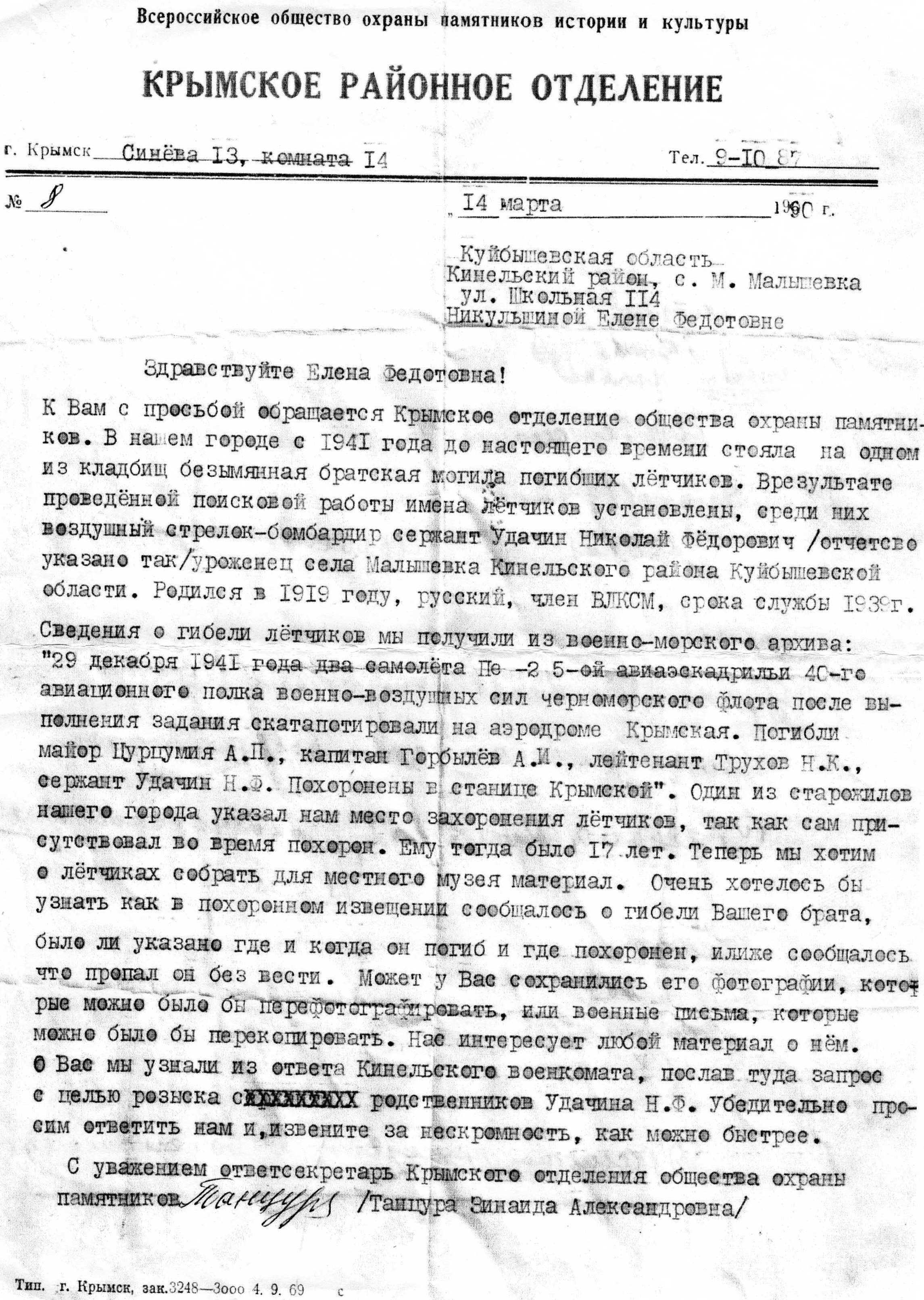 Николай Удачин родился в 1919 году. На фронт призвали в 1941 году. Младший лейтенант. Погиб в декабре 1941 года. Информации на сегодняшний день больше нет.